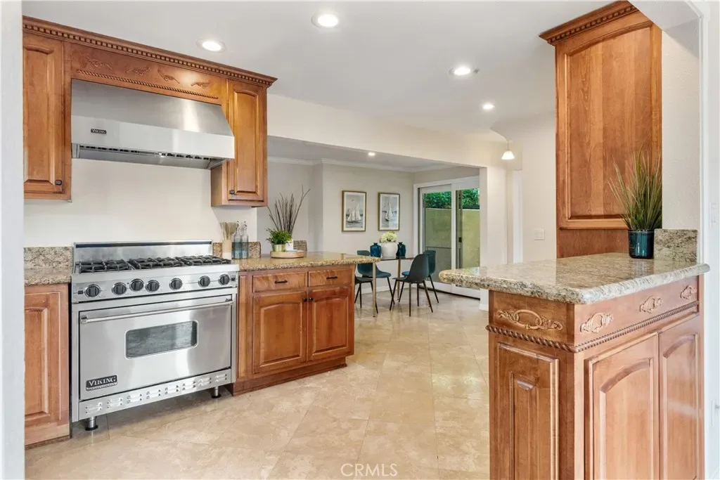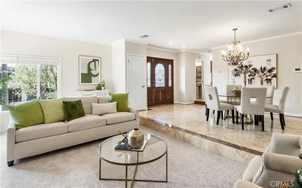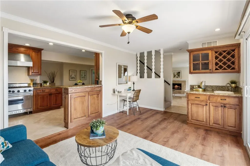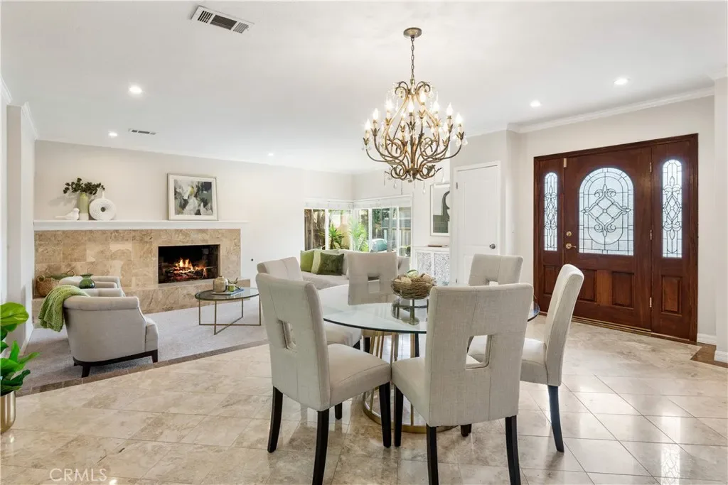 The home boasts soaring 10-foot ceilings, crown moldings, and recessed lighting throughout, creating a bright and airy atmosphere. Recent upgrades include plush new carpeting and stylish laminate flooring. The living room features an inviting gas fireplace and multiple sliding doors that seamlessly connect to indoor and outdoor living spaces, ideal for entertaining and relaxation.