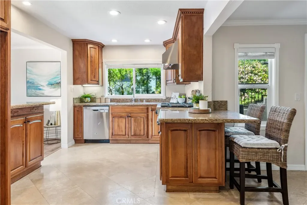 The gourmet kitchen showcases dark brown cabinetry, high-end appliances, and a charming breakfast area, perfect for casual dining. Step outside to a large, private side yard with decks designed for outdoor dining, conversation, and unwinding while enjoying breathtaking ocean and Catalina views from the upper level.