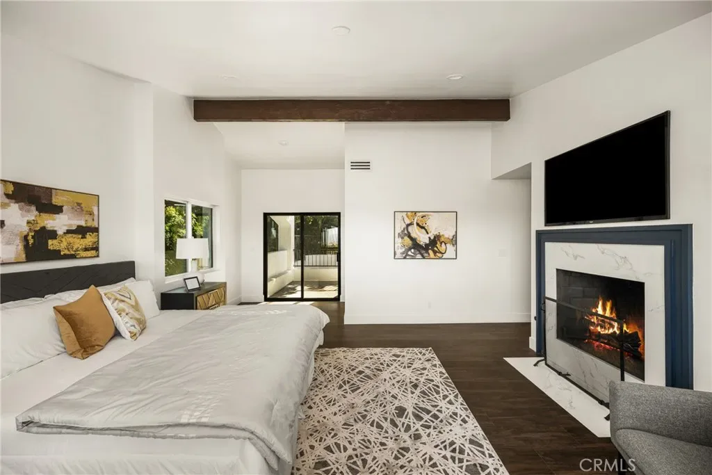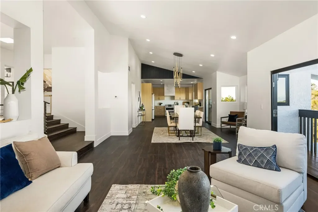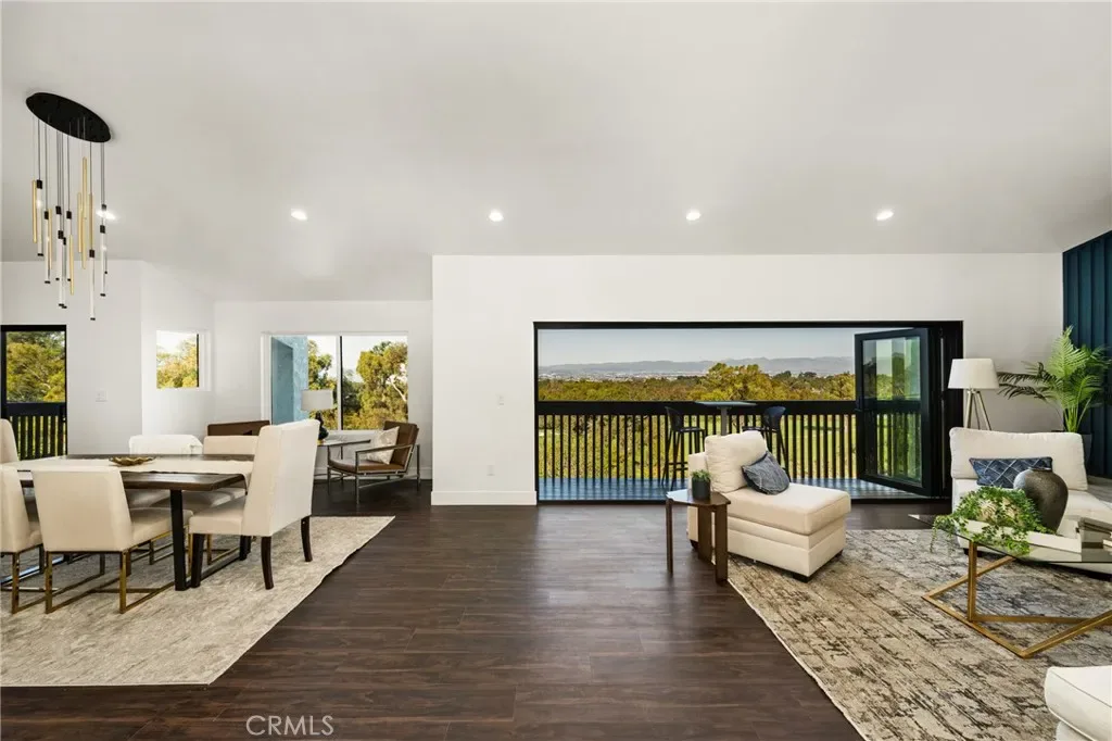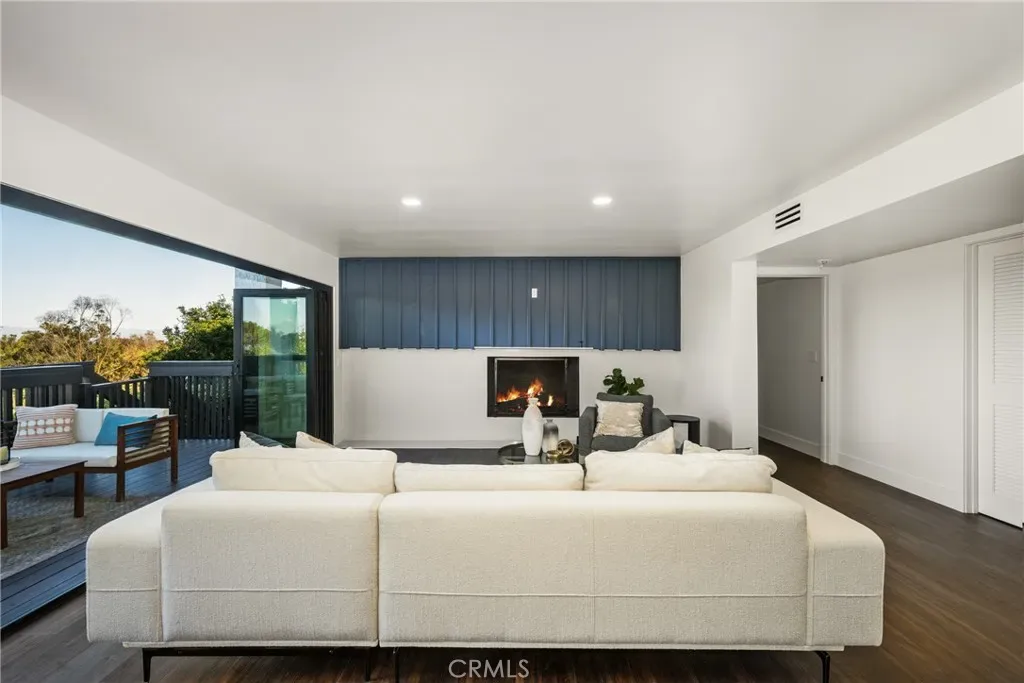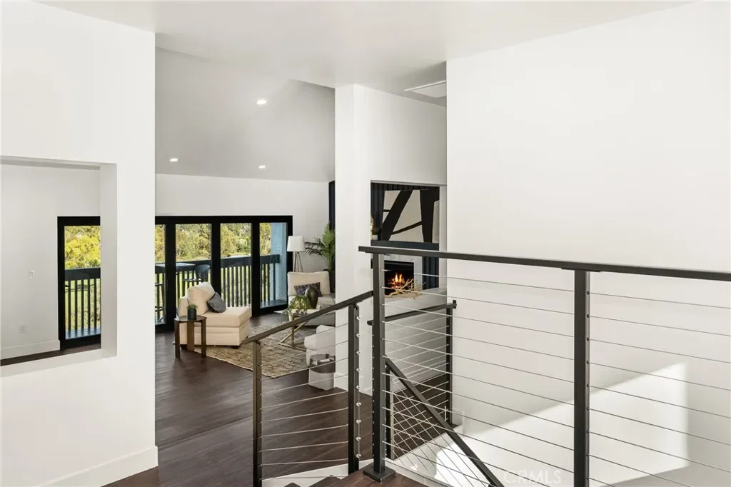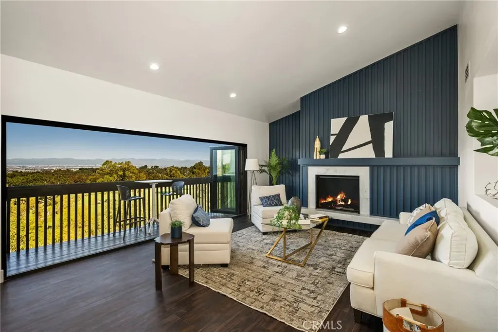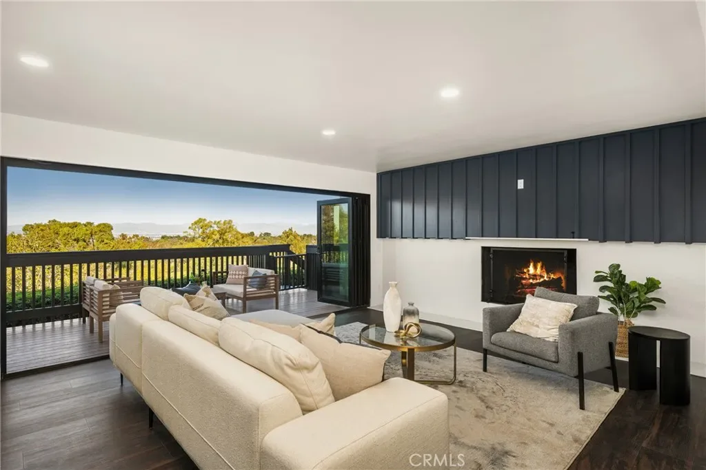 The property features a reverse floorplan that places the main living areas and primary suite on the upper level, perfect for enjoying the sweeping views, while the majority of the bedrooms are privately tucked below. Both levels offer a light filled layout with brand new LaCantina win-doors and windows that bring the outdoors in. The spacious living room, formal dining area, and open kitchen flow effortlessly to expansive view decks, ideal for entertaining. The kitchen is equipped with matte white Café appliances that combine high end design with professional grade performance. The upstairs primary suite features a fireplace, walk-in closet, and its own private balcony. A guest powder room completes the upper level