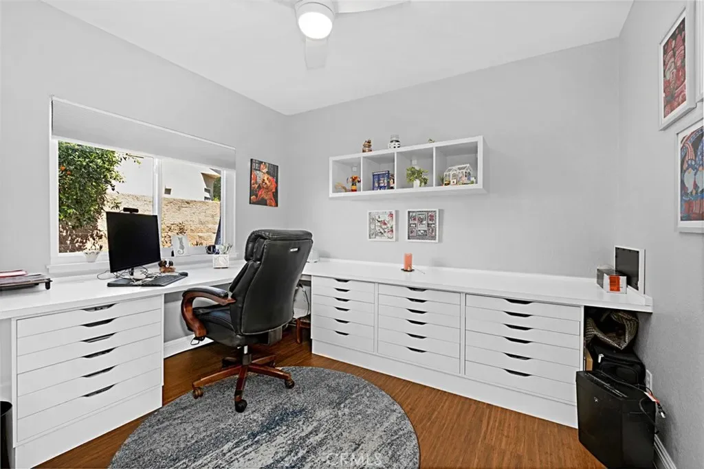 The primary suite features a large open shower with rainfall head and updated finishes. The desirable downstairs bedroom is currently configured as a hobby room/office with extensive built-ins and workspace, easily returned to a traditional bedroom if preferred.