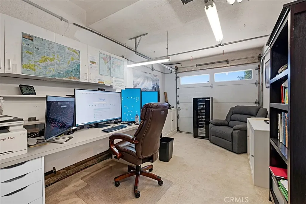 The single-bay portion of the 3-car garage has been fitted as a private office or studio with dedicated A/C, hard-wired security system infrastructure, compressor, and added outlets. Some patio furniture will remain.
