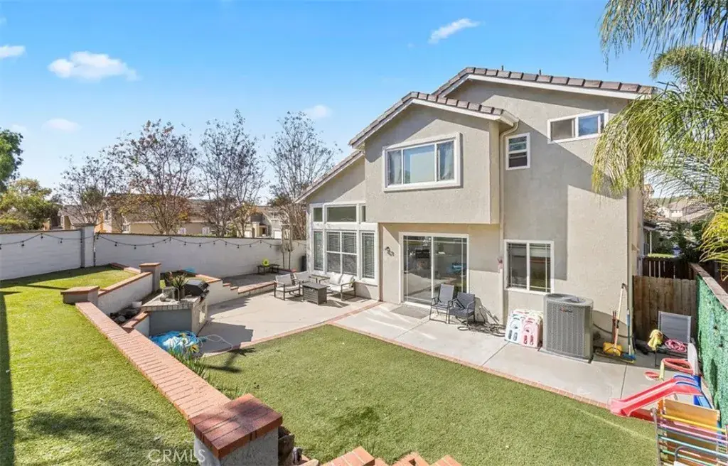 The private rear yard is thoughtfully designed and ideal for relaxing or entertaining, featuring brick-accented concrete decking, built-in planters, and a grassy area perfect for pets or play. This home offers exceptional value with some of the lowest HOA dues in the surrounding area, a low tax rate, and no Mello-Roos, while still providing an impressive array of resort-style amenities.