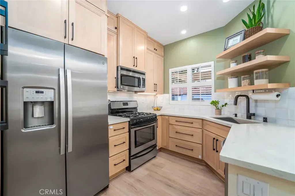 The newly remodeled kitchen is a showstopper—featuring quartz countertops, a custom tile backsplash, stainless steel appliances, floating shelves, and extended ceiling-height cabinetry. A removed wall and raised ceiling enhance the sense of space, while a window near the sink brings in even more light. The kitchen flows seamlessly into the dining area, perfect for entertaining.