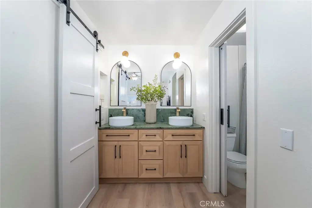 The dining area boasts custom built-in bench seating with storage and designer lighting. Both bedrooms include ceiling fans, with the primary suite offering a walk-in closet with stylish barn doors and a fully updated ensuite bath featuring a new fiberglass tub/shower combo, dual vanities with quartz counters, and modern vessel sinks. The secondary bedroom, currently used as an office, includes a mirrored wardrobe and easy access to a second updated full bath.