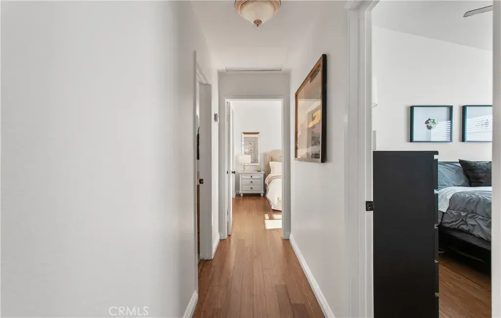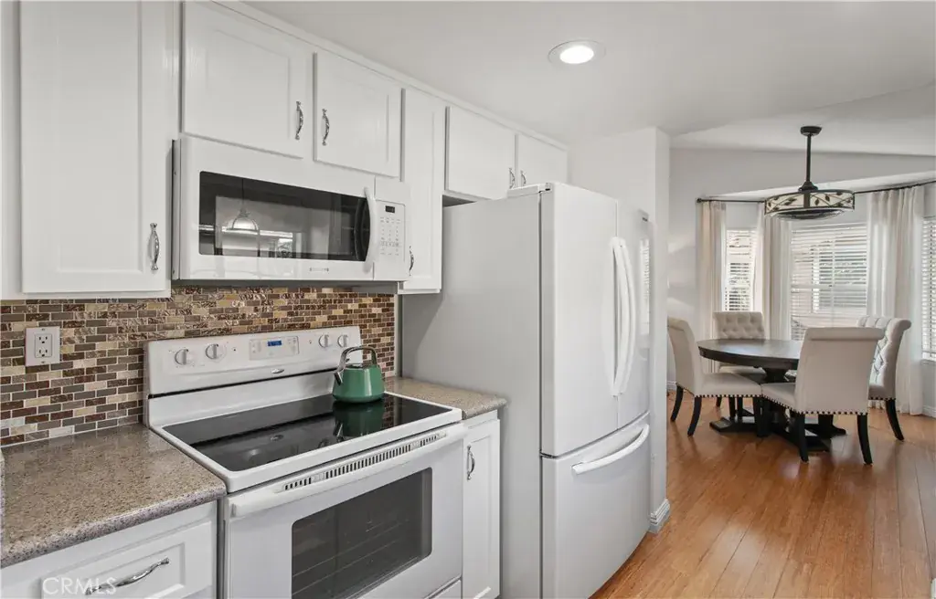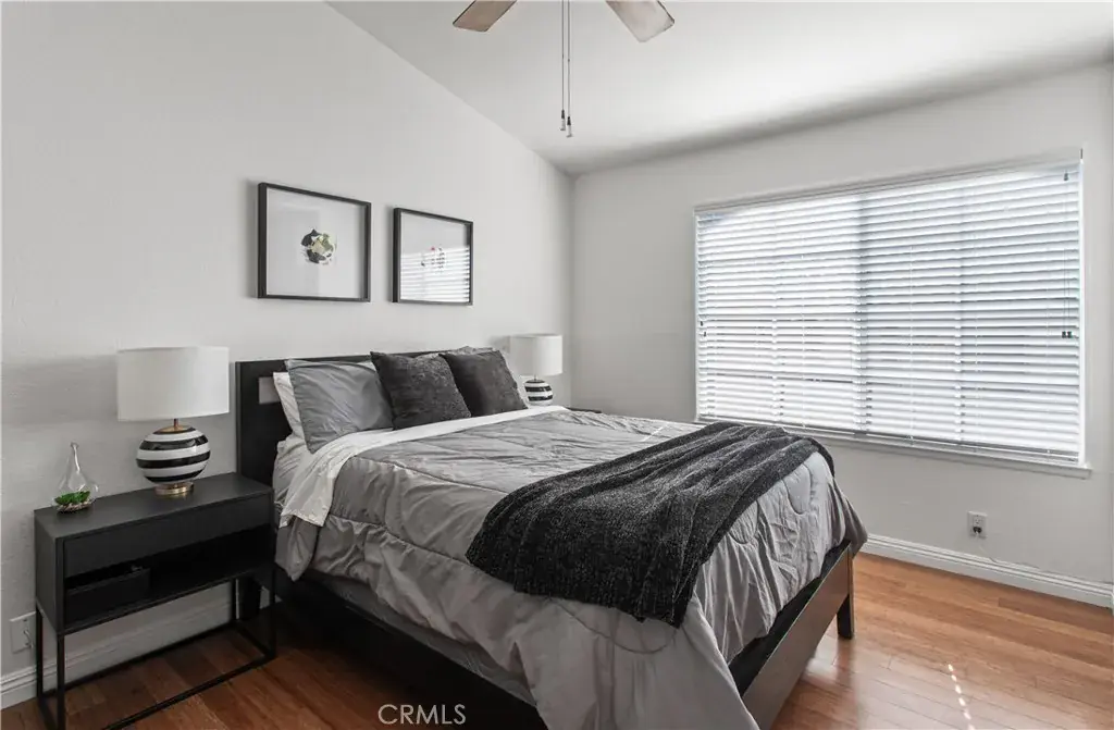 The updated kitchen features new countertops, white refaced cabinetry, recessed lighting, Bosch dishwasher, built in microwave, French door refrigerator and an electric range. Real bamboo flooring throughout adds an elevated touch. Retreat to a spacious primary suite with vaulted ceilings, dual closets and its own private balcony. A remodeled secondary bathroom with walk-in tiled shower and modern black fixtures add to the home’s move-in ready appeal. In-unit washer and dryer are conveniently located within the secondary hall bathroom. Central A/C and heating.