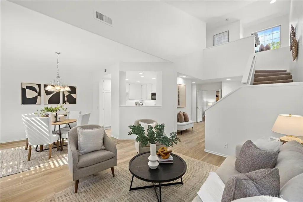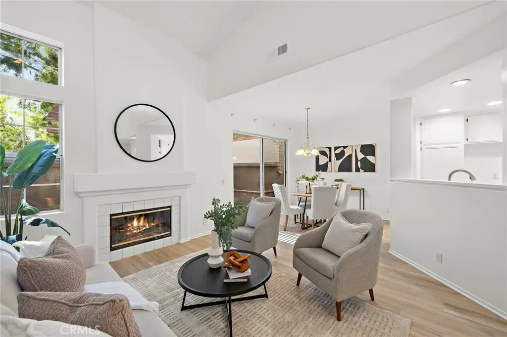 ABSOLUTELY STUNNING! A beautiful just remodeled and updated, move in ready home in the highly sought after Sonoma Court community, 73 Morning Glory blends modern upgrades, natural light, high ceilings and an ideal central location. This interior unit, close to pool, offers approximately 1,422 sq. ft. of thoughtfully designed living space, featuring 3 bedrooms, 3 FULL bathrooms, and a 2 car attached garage with exceptional custom enhancements. The open floor plan is highlighted by soaring approx. 20 foot vaulted ceilings, Luxury Vinyl Flooring, high grade designer low pile carpet, and a spacious and open living room anchored by an inviting fireplace. The remodeled kitchen is standout, showcasing new crisp white quartz counter tops, white lacquered cabinetry, extra side shelves, quartz backsplash, stainless steel deep sink. Eat in dining area with view of private patio. Upstairs, the primary suite offers a bright and open layout, two closets and an ensuite bathroom with dual sinks, a step-in shower, and a private toilet closet. The secondary bedrooms with mirrored wardrobes and a full bath complete the upper level. A private enclosed patio provides the perfect space for outdoor dining, and entertainment. Convenience is built into every detail, Gated entry to front door for added privacy, an indoor laundry, several storage areas, recessed LED lighting, and direct garage access. Residents enjoy access to SAMLARC amenities, including pools, parks, trails, the Beach Club and lagoon, sports courts, and community facilities. The home is ideally located near top rated schools, shopping, dining, and the CA 241 toll road. This property offers comfort, style, and an unbeatable location in Rancho Santa Margarita.