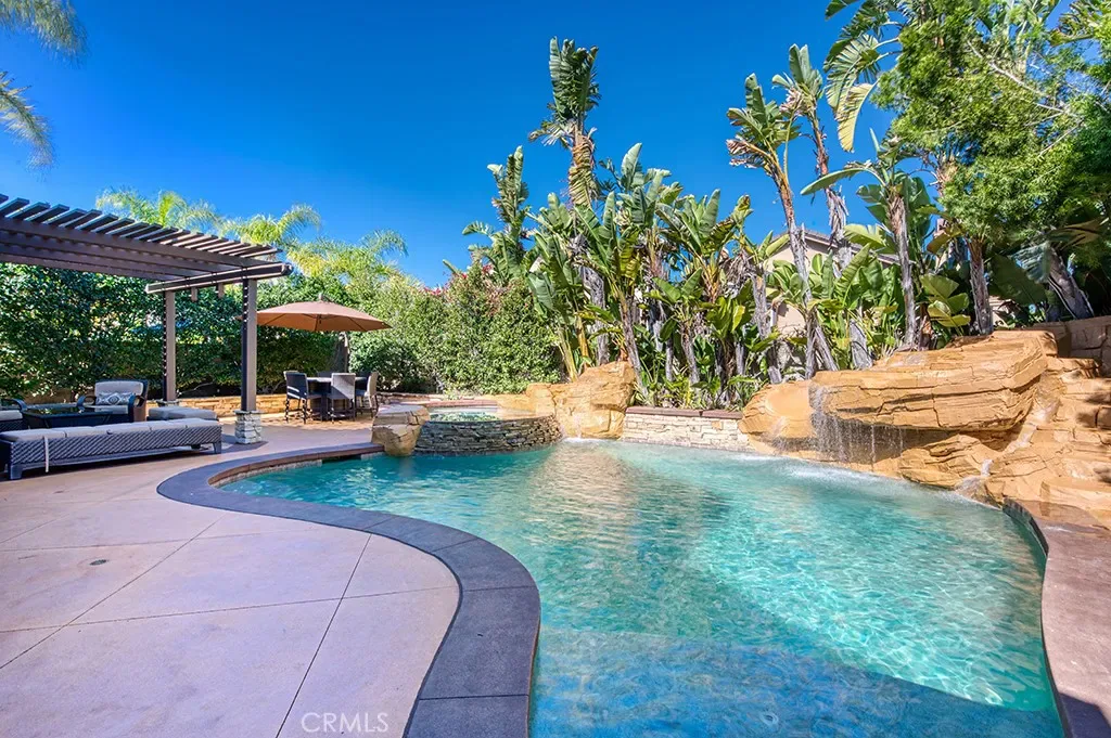 Welcome to 1 Saint Elias, a beautiful 5-bedroom pool home with a versatile loft located in the prestigious guard-gated community of Dove Canyon. This spacious and functional floor plan features a convenient downstairs bedroom with ceiling fan, recessed lighting, mirrored closet, and private en-suite bath, ideal for guests or multi-generational living. The main level offers formal living and dining rooms along with an inviting family room with fireplace that opens to the kitchen. The remodeled kitchen features new countertops, soft-close cabinets, a dining nook, double ovens, newer appliances, and a walk-in pantry. A separate laundry room includes a new washer and dryer. Upstairs you will find four additional bedrooms plus a loft and new carpet throughout the second level. Bedrooms feature mirrored closets, including a spacious bedroom with vaulted ceilings, while the shared bathroom has been updated with new countertops. The primary suite offers vaulted ceilings, a cozy fireplace, and two walk-in closets. The primary bathroom features dual vanities, a soaking tub, and a walk-in shower. Additional upgrades include plantation shutters throughout and a recently replaced whole house fan. The private backyard is designed for entertaining with a saltwater pool and spa featuring a slide and waterfall. A covered pergola provides shaded outdoor living space and mature privacy landscaping surrounds the yard. Additional highlights include a three car garage with storage, new garage doors and pavers. Access to Dove Canyon community amenities including pool, spa, tennis courts, pickleball, parks, and scenic hiking and biking trails. Conveniently located within walking distance to Santa Margarita High School and nearby restaurants and cafés, this home offers comfort, space, and an exceptional lifestyle in one of South Orange County’s most sought-after communities.