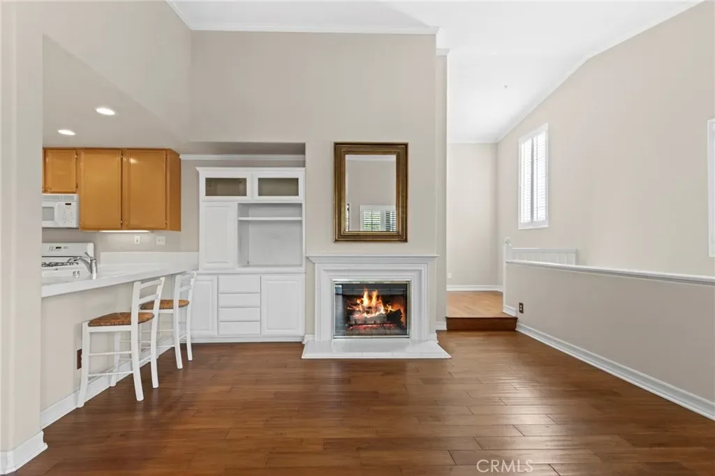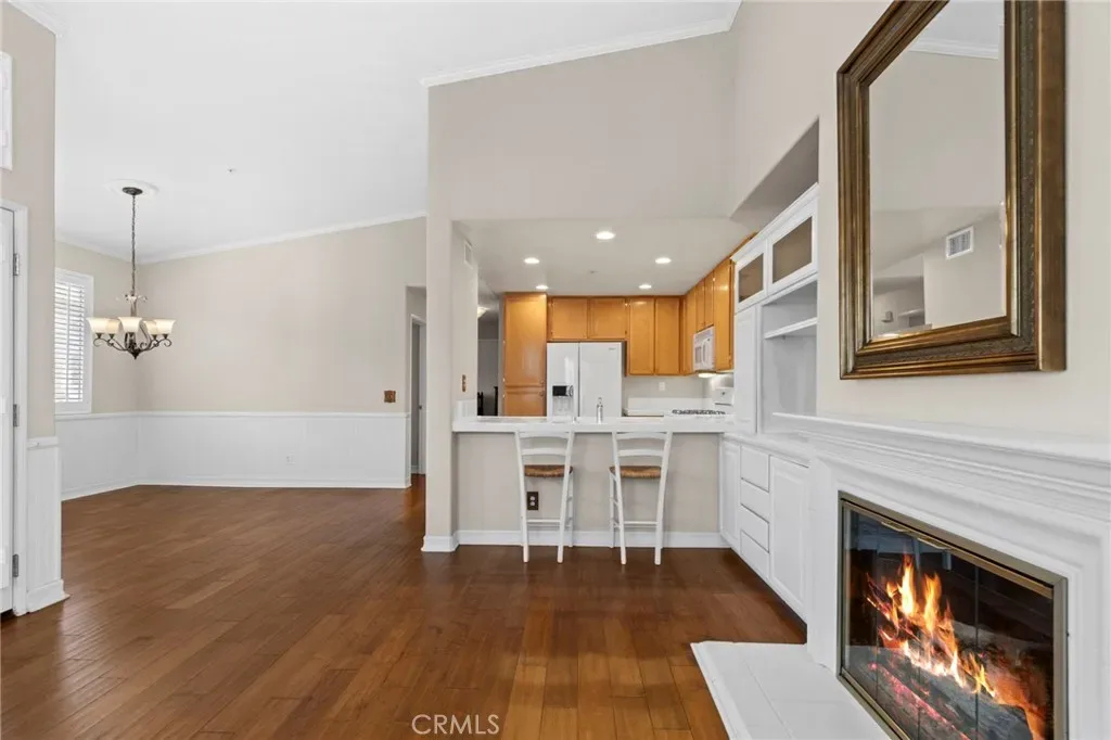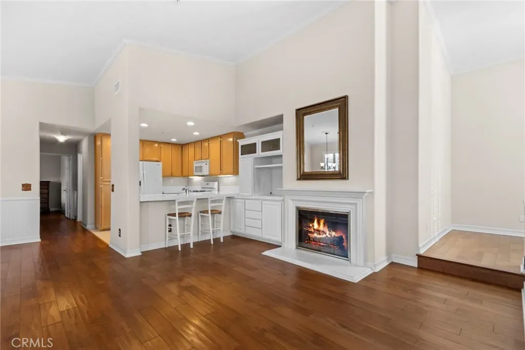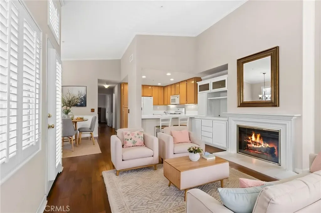 Welcome to this Charming and Beautifully Light-filled 2 bedroom 2 bathroom condo that perfectly blends comfort, style & functionality. With desirable Southern Exposure the home is bathed in natural sunlight. Fully appointed with Rich solid hardwood floors and designer shutters throughout as well as wains coating enhancing the Dining Area. The Primary Living area features an elegant fireplace perfect for relaxing evenings and entertaining guests. The kitchen features additional counter height seating, 4 burner gas stove & built-in microwave, dishwasher and Brand New Refrigerator. Both bedrooms are generously sized, including a Comfortable Primary Suite with it’s own private bath, double vanity & spacious walk-in closet. The second bedroom and bathroom offers flexibility for guest, family, or home office. The thoughtfully designed layout includes an added cozy library nook providing the perfect spot for reading or creating your own quiet retreat. Enjoy indoor outdoor living on the private balcony patio ideal for morning coffee or outdoor dining. Additional highlights include an attached 1 car garage complete with full size laundry area.