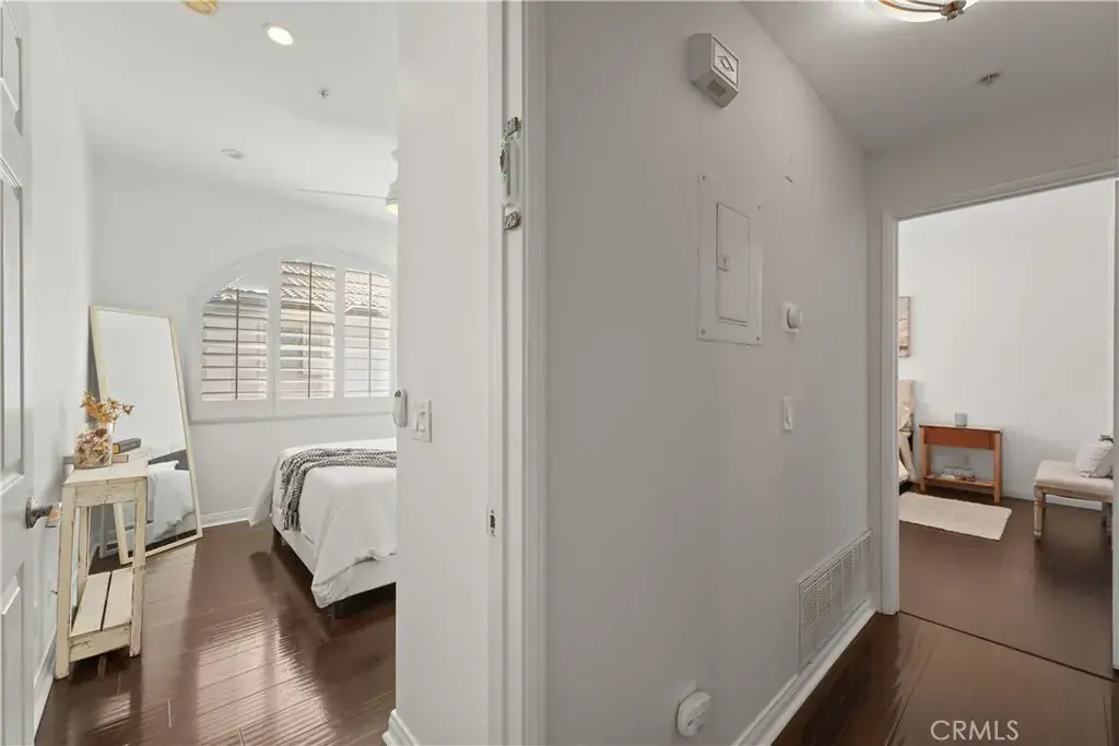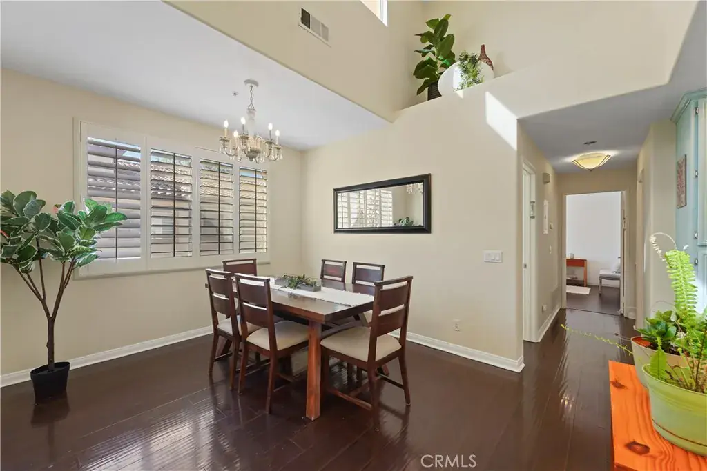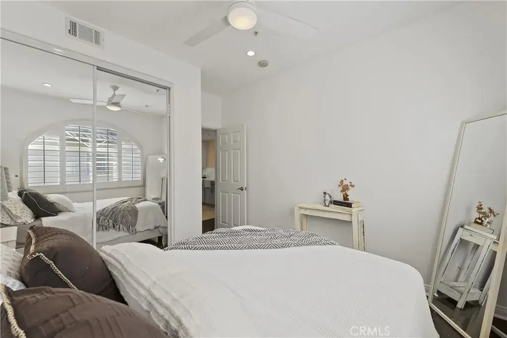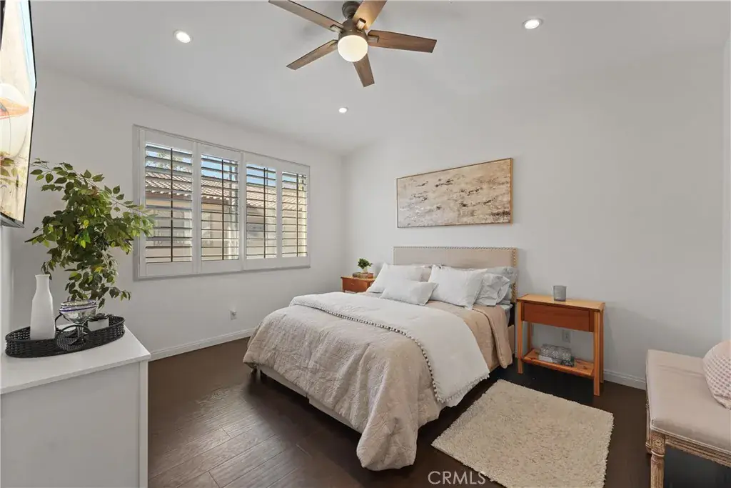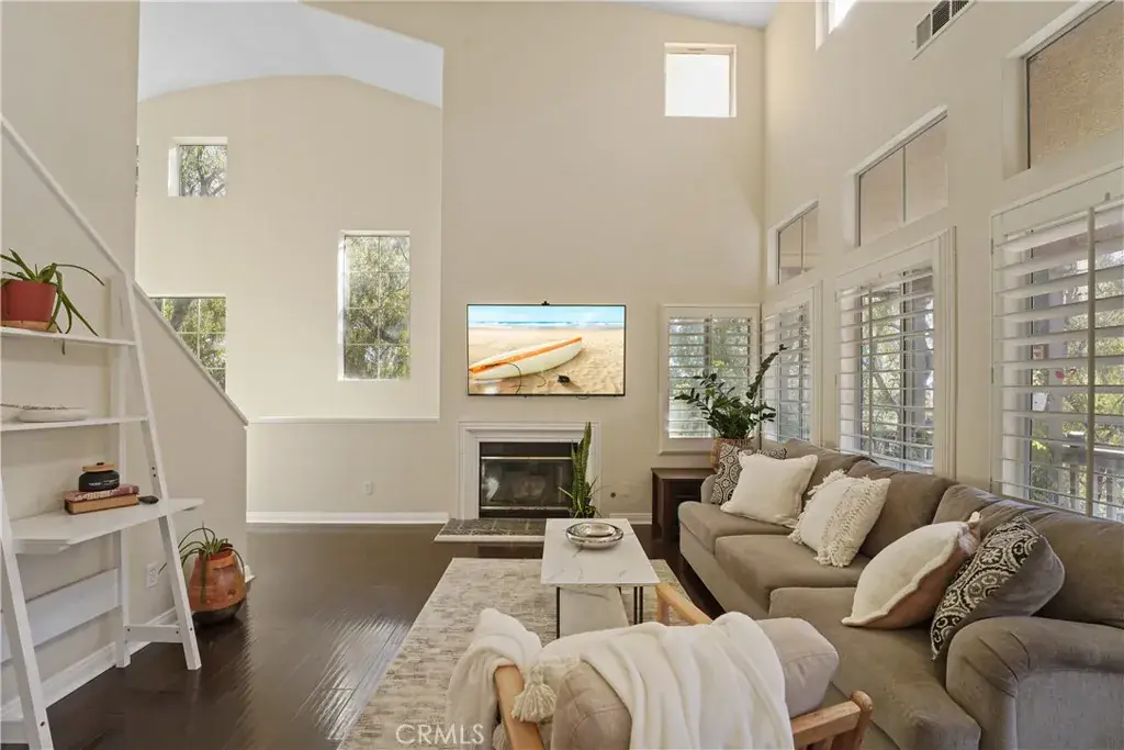 Enter through your private entry and climb to your single-level living area, where vaulted ceilings, abundant light, wood floors, plantation shutters, and a cozy fireplace greet you. The open floor plan flows through a generous living room, defined dining area, and a convenient workspace tucked beneath the stairs. The loft area offers tremendous flexibility — ideal for a second office, creative space, or home gym. The primary suite features a large walk-in closet with custom shelving and a generous bathroom. Enjoy afternoon sun on the balcony — perfect for relaxing or entertaining. All appliances are included, and laundry is located in the garage. With no one above or below and only one shared wall, this home offers the best of condo living in a peaceful Rancho Santa Margarita community. The end-unit is especially private, with the front door facing trees and shrubs. As a member of the SAMLARC community, residents gain access to an impressive amenity package — including the man-made Lago Santa Margarita and Beach Club lagoon, multiple pools, and an extensive network of parks and trails.