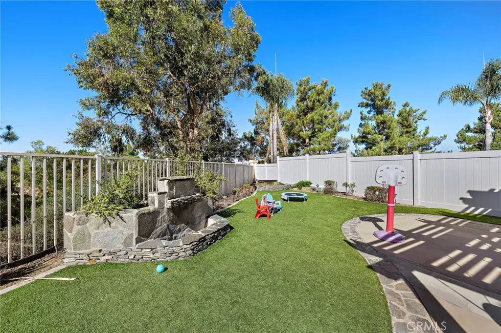 The private backyard is an outdoor retreat, featuring a covered patio, built-in BBQ island, tranquil water fountain, and secure fencing — perfect for relaxation and entertaining. Additional highlights include a 3-car garage (one bay converted to storage), central A/C, forced heating, laminate and carpet flooring, and an individual laundry room.