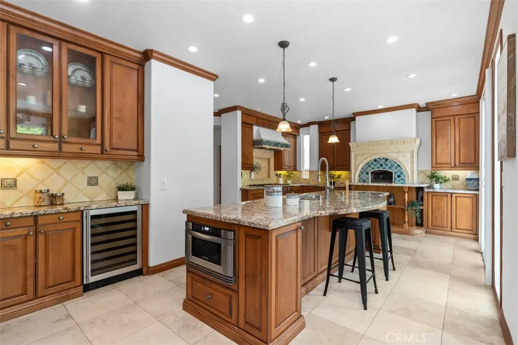 The chef’s kitchen is truly exceptional, featuring a large granite center island with bar seating, a built-in drawer microwave, professional Decor range and double ovens, a custom built-in wood pizza oven, wine refrigerator, and two oversized chef-style refrigerators, perfect for hosting and everyday luxury living.