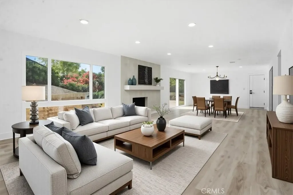 Light & Airy: Huge windows flood the living area with natural light, centered by a cozy modern tiled fireplace with a black wood mantle.