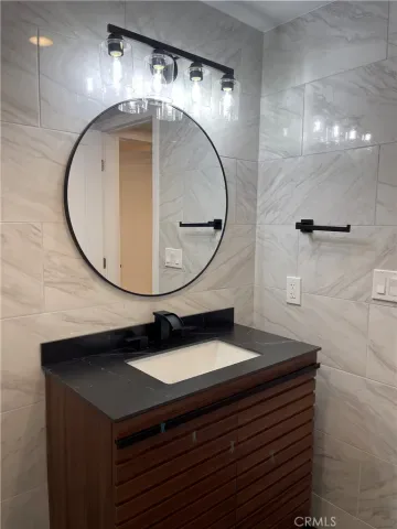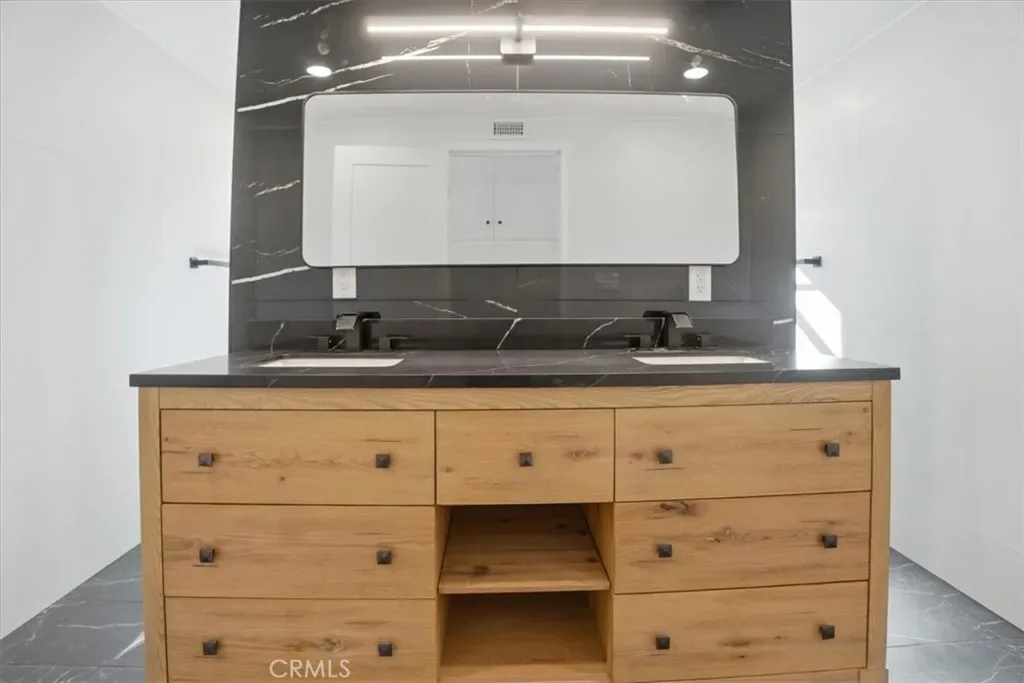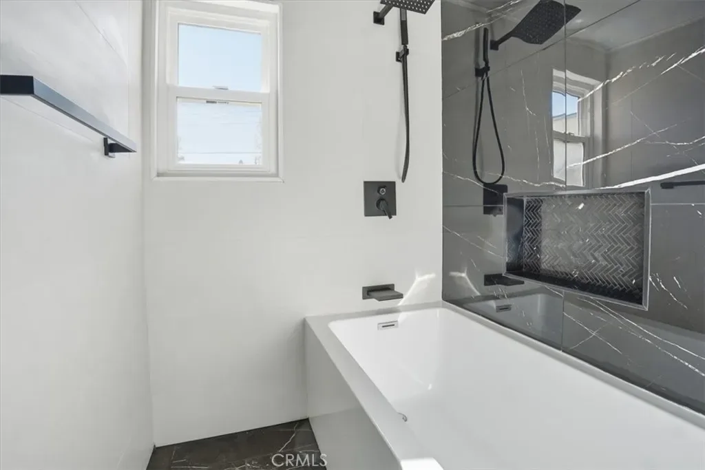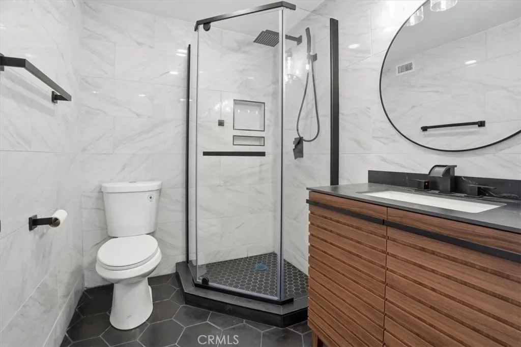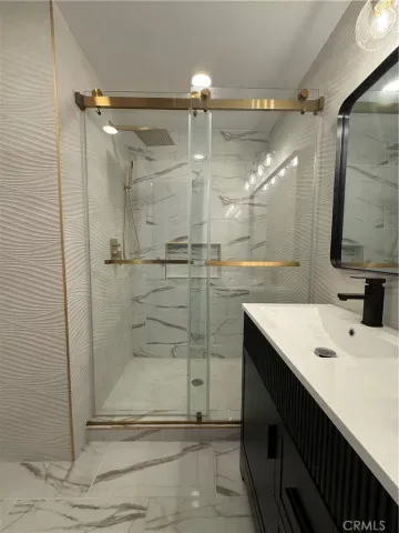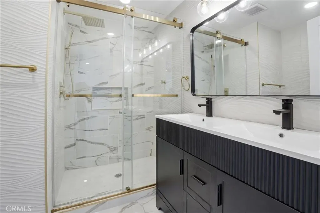 Spa-Like Baths: Porcelain marble-style flooring, rectangular tile showers, and contemporary wood vanities with matte black and gold fixtures.