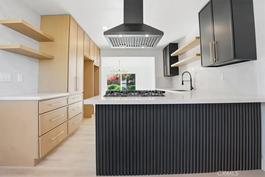 A beautiful social island with a built-in range and a sleek, modern hood vent.