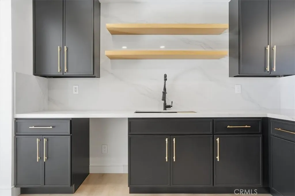 Striking quartz marble-design countertops and a black stainless steel drop-in sink.