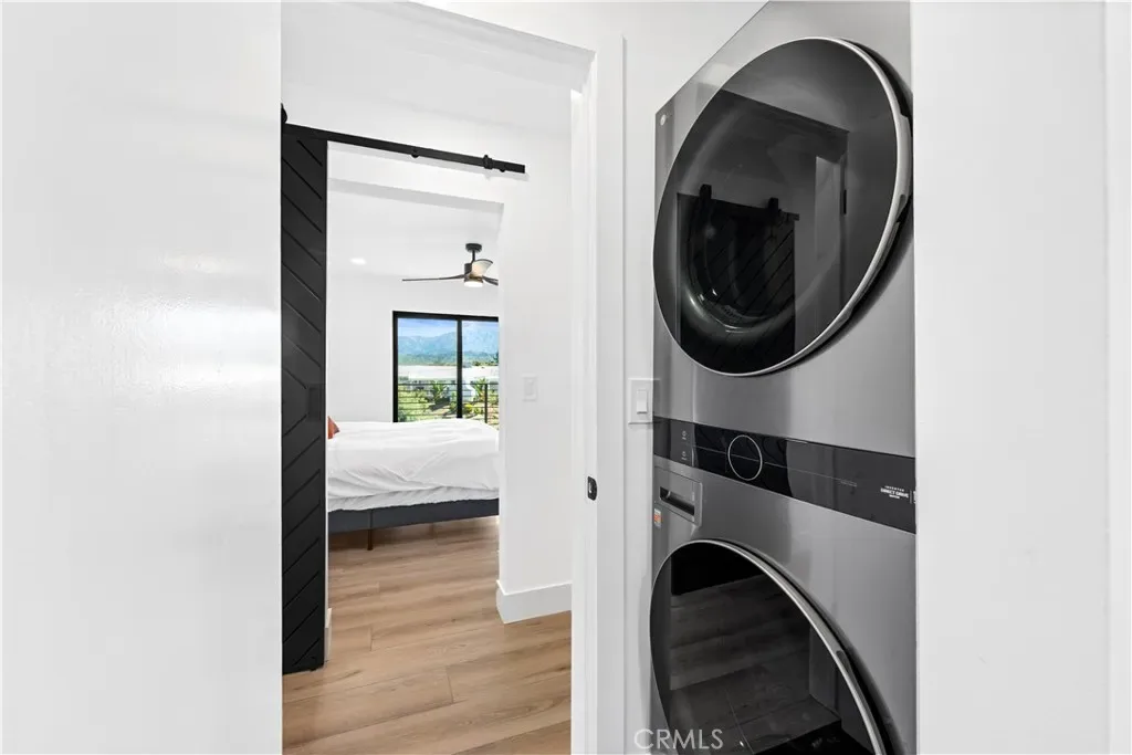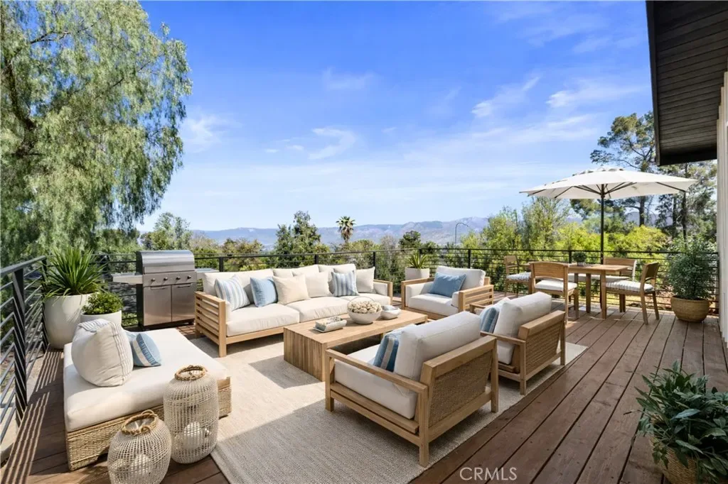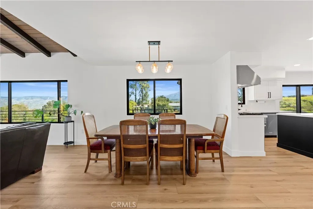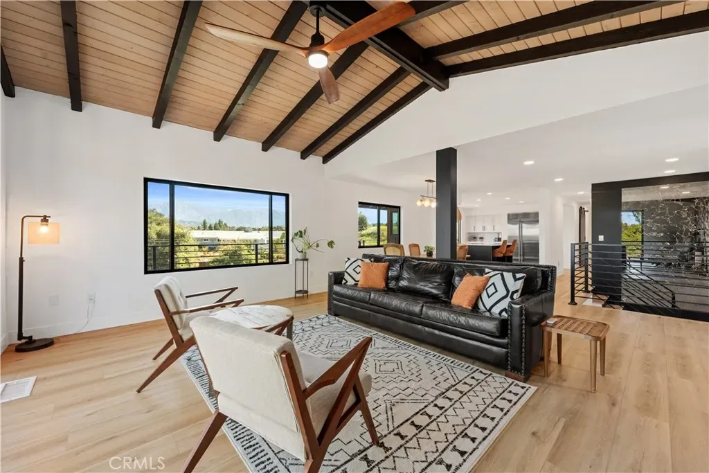 leads you to a spacious residence designed for one-family living with two individual living areas, offering the perfect balance of comfort and functionality. Inside, the open-concept design with exposed beams invites natural light. Open concept from the entry, to the living room, dining room, and kitchen makes it ideal for both daily living and entertaining. The updated kitchen is equipped with quartz countertops, a Sub-Zero refrigerator, and a Viking professional stove/oven, opening to the dining and living areas. The primary bedroom has stunning views, a luxurious ensuite bathroom