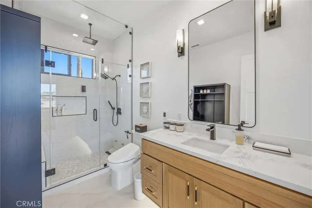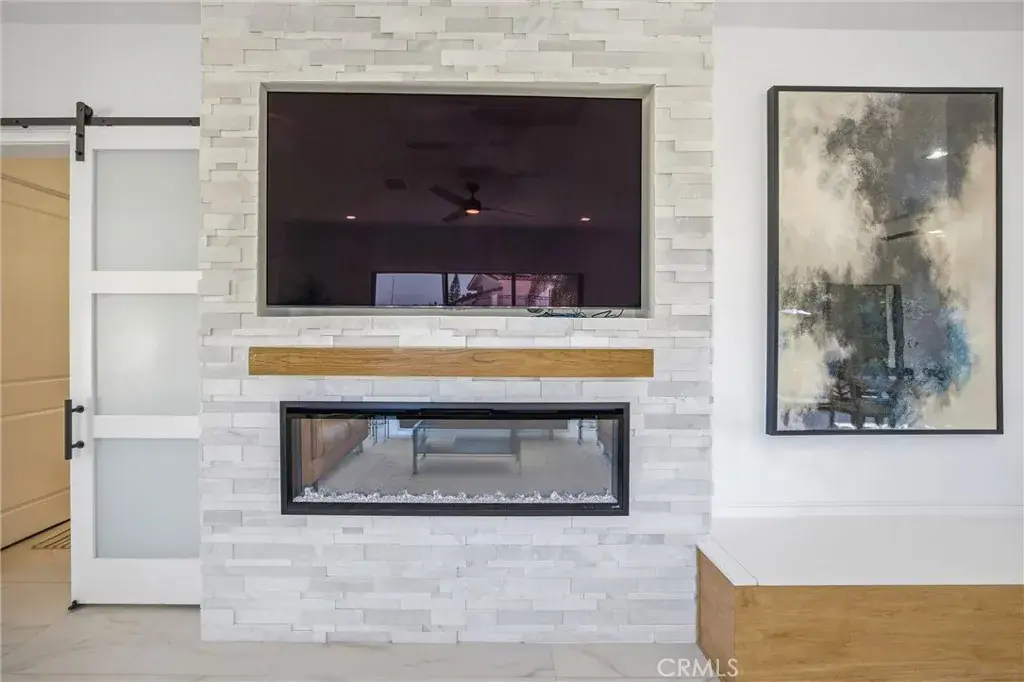 The detached pool house, completed in 2025 and less than one year old, offers 1,948.5 square feet of modern luxury with 2 bedrooms (no closets) and 2 bathrooms. This contemporary residence is fully furnished with designer pieces and features an open-concept living area with floor-to-ceiling windows, a modern kitchen with white cabinetry and quartz countertops, two fireplaces, and automated window shades. Both bathrooms feature steam showers, radiant-heated floors, and heated toilets. The private second-story balcony overlooks the pool area. Integrated security cameras and smart home features are included throughout.