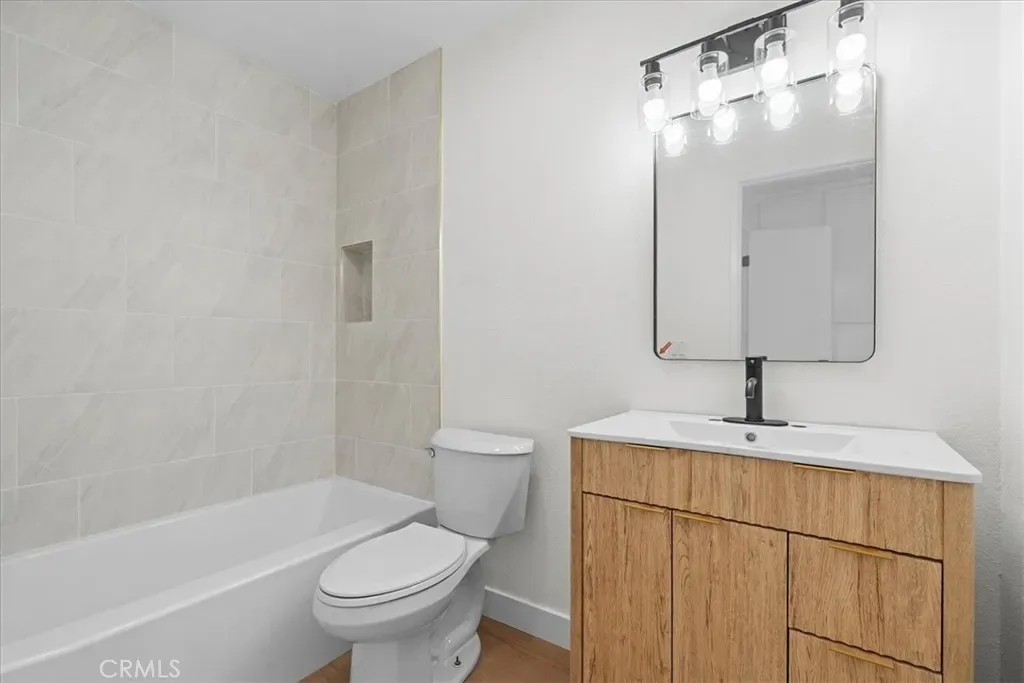 The bathroom features a stylishly tiled shower along with all-new fixtures, including a modern vanity, mirror, and lighting. Additional upgrades include updated lighting and a brand new thermostat for added comfort and efficiency.