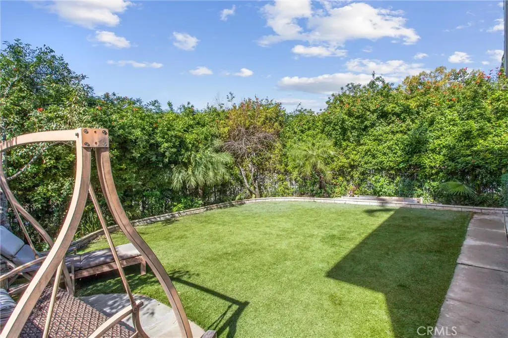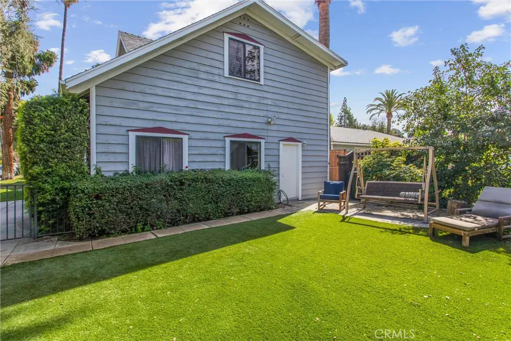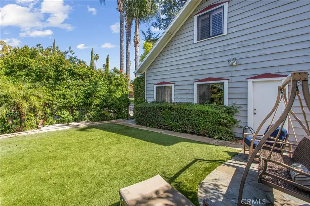 Bright and airy throughout, the home is filled with natural light streaming through dual-pane windows accented by plantation shutters. Outdoor spaces are equally delightful, with a covered patio featuring a river rock planter, lush foliage, and an orange tree. The quaint side yard offers tall fescue grass along with mature orange, nectarine, and tangerine trees — a true garden retreat.