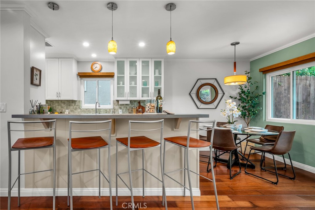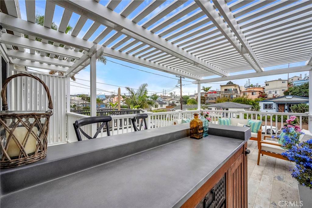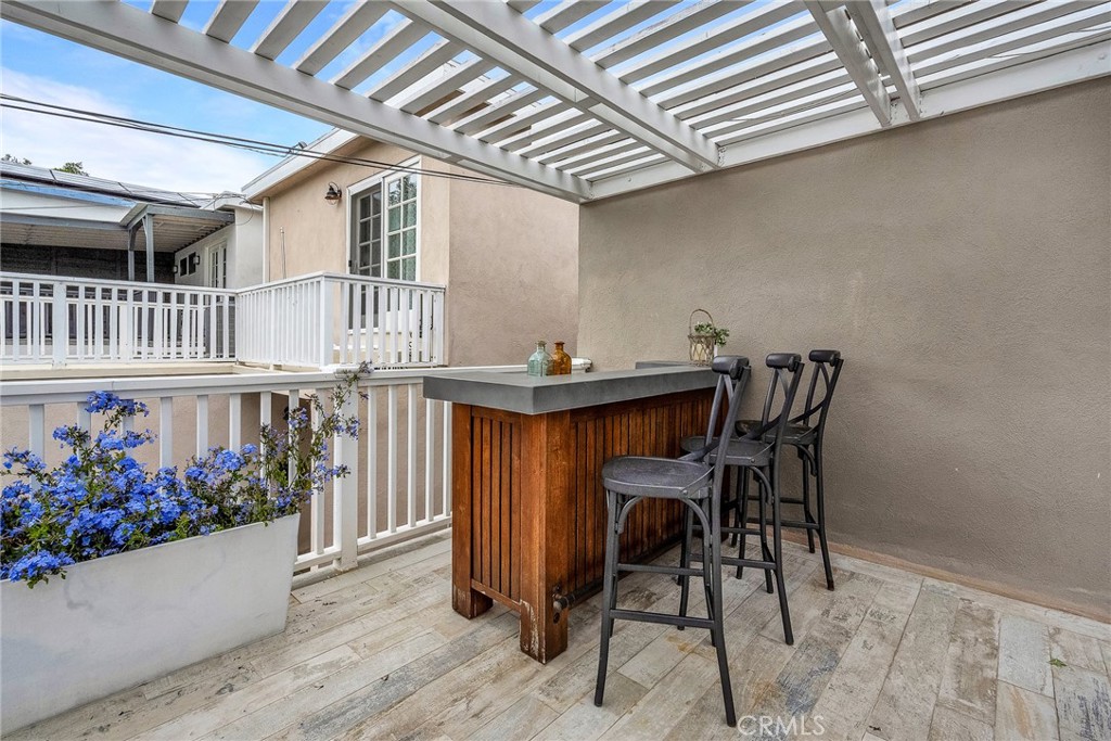 The open floorplan includes a bright living and dining area with fireplace and sliding doors to a beautiful private patio—great for BBQs and warm summer nights. The updated kitchen has newer appliances plus a sweet breakfast counter. Upstairs, enjoy three bedrooms and a sunny nook (or office space) leading to a front deck with a white pergola, balcony, and wet bar—an entertainer’s dream.
