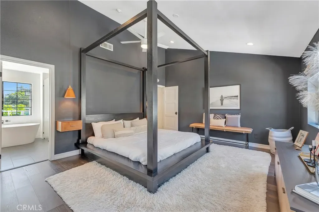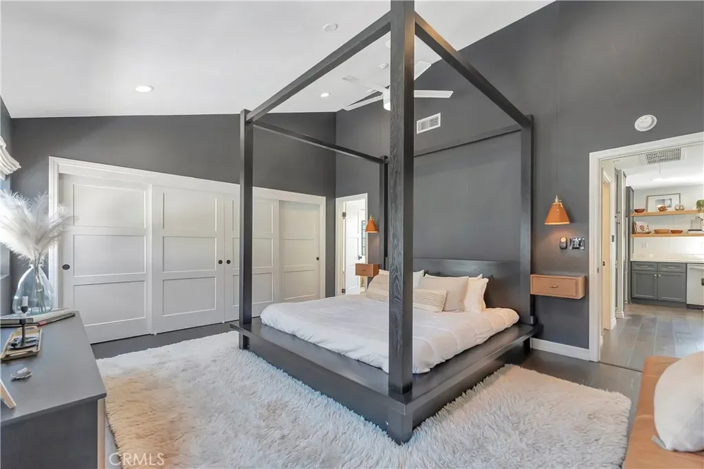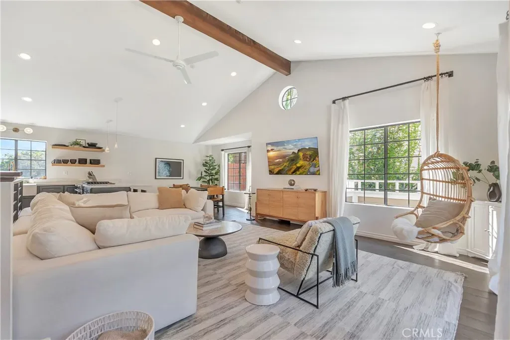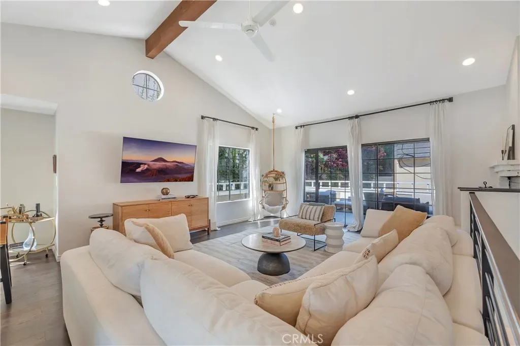 Situated as the rear unit in the complex, the home provides enhanced privacy along with a nearby guest parking space located just outside the unit. The interior features vaulted ceilings, hardwood flooring throughout, and an open kitchen floor plan with updated finishes and a functional layout.