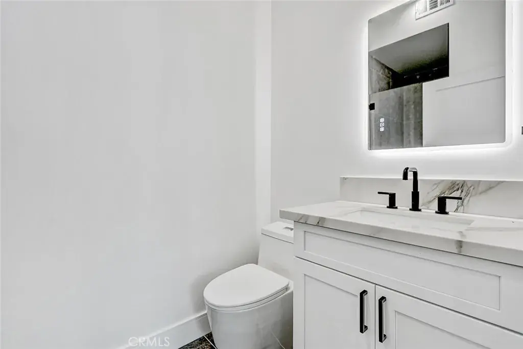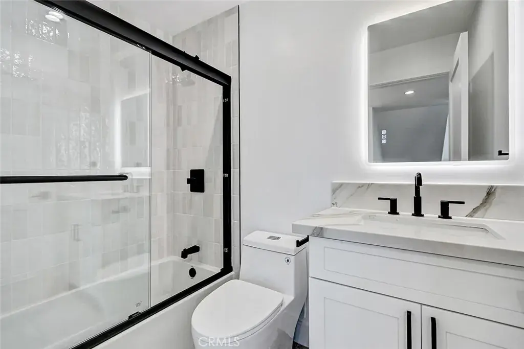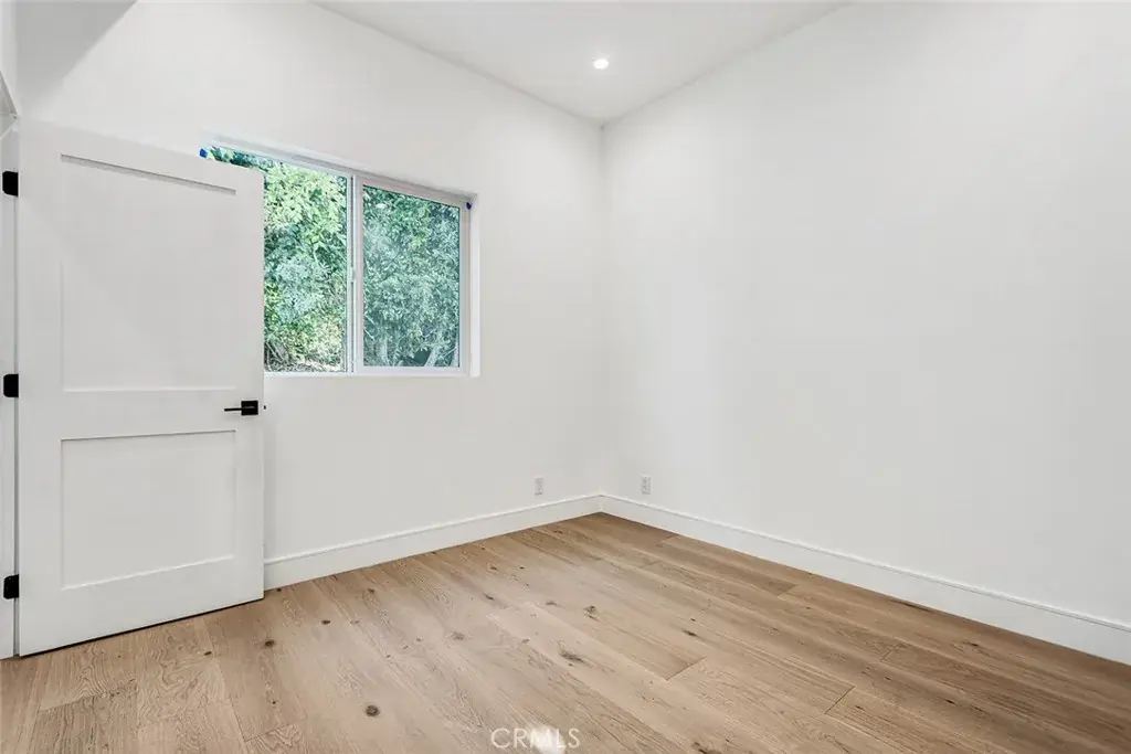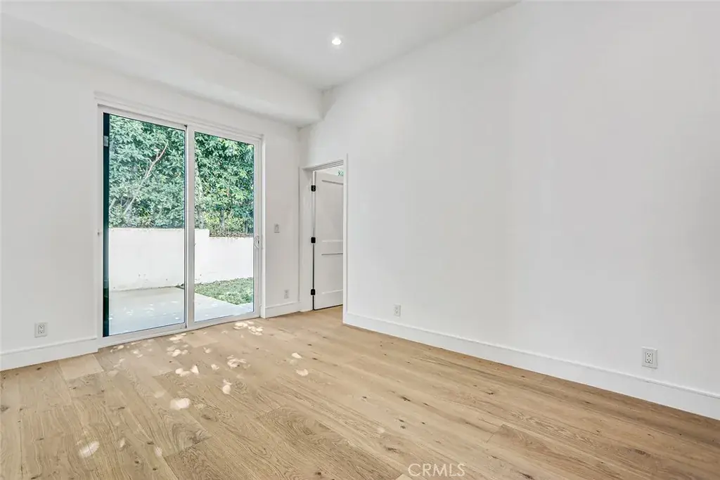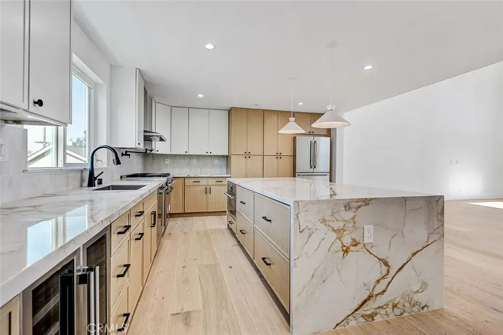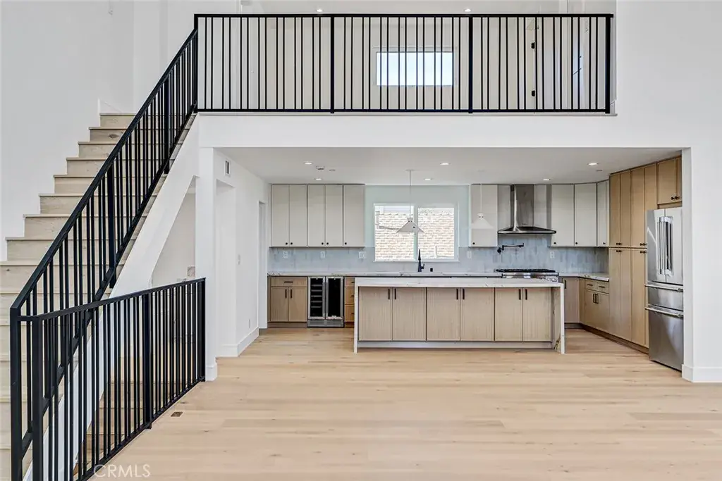 The home features an open and bright floor plan, anchored by a stunning chef’s kitchen, equipped with premium Thermador appliances, custom-designed cabinetry, and a dramatic waterfall-edge island that serves as both a functional workspace and an elegant focal point for gathering. Engineered hardwood floors flow throughout the home, enhancing the sharp and clean aesthetic. The second floor living area is highlighted by soaring 18-foot ceilings, creating a bright and airy atmosphere that elevates everyday living.