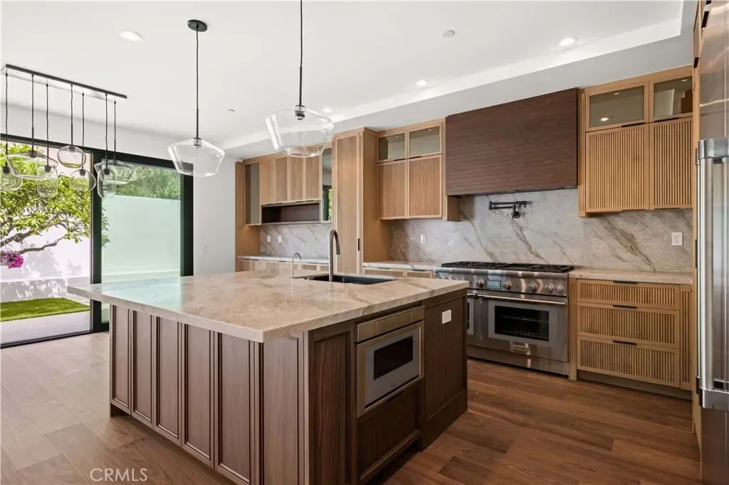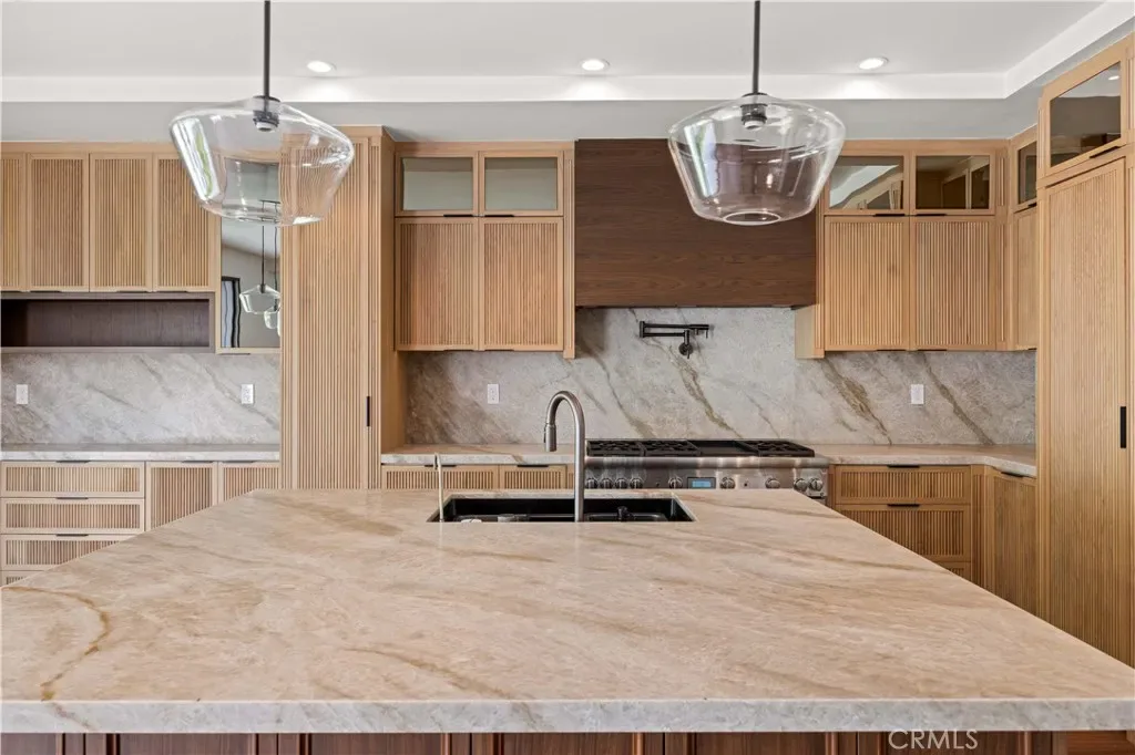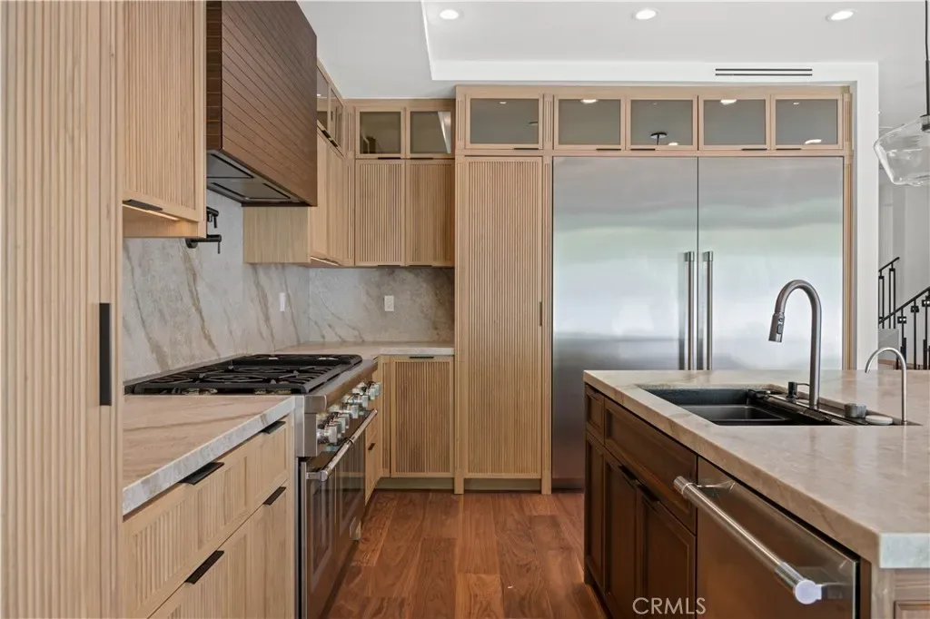 There is a tactile poetry to the finishes: plumbing fixtures of a caliber rarely encountered, evoking the understated opulence of homes valued at multiples beyond; cabinetry in European white oak, its pale grain catching and reflecting light with gentle elegance; and a sculptural walnut island that anchors the kitchen as both a functional centerpiece and a work of design.