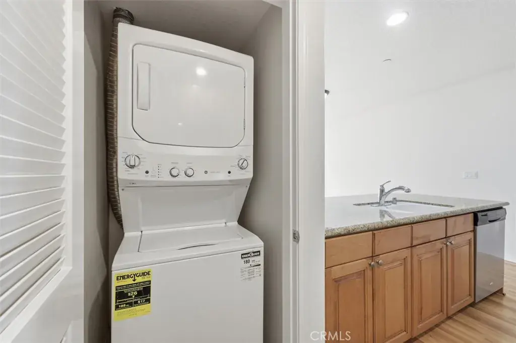 The home has been freshly painted throughout and features brand new wood flooring. The features granite countertops, custom cabinetry, a breakfast bar, dishwasher and brand-new stove, and refrigerator. The stackable washer/dryer is only one year old. The spacious primary bedroom includes a walk-in closet and an ensuite bathroom. The second bedroom is light-filled and well-sized, with convenient access to its own updated bathroom—ideal for guests or a home office.