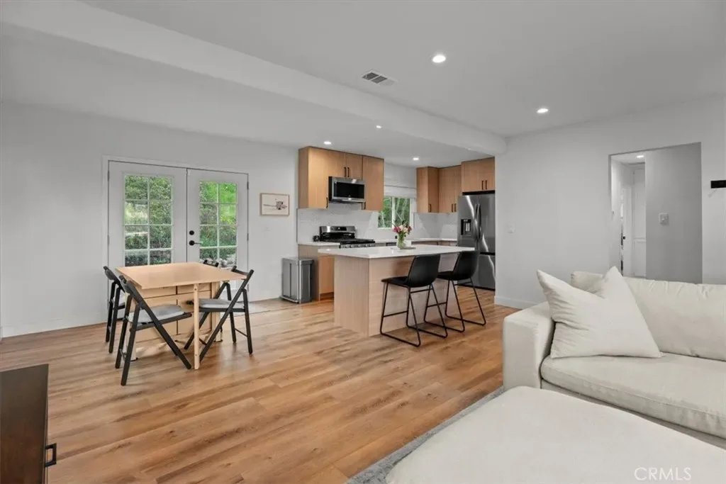 The interior showcases open-concept living and dining areas filled with natural light and enhanced by stylish finishes, seamlessly connecting to an expansive backyard perfect for gatherings. The updated kitchen is a chef’s dream, featuring stainless steel appliances, new countertops, new cabinetry, and a center island designed for both function and connection.