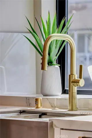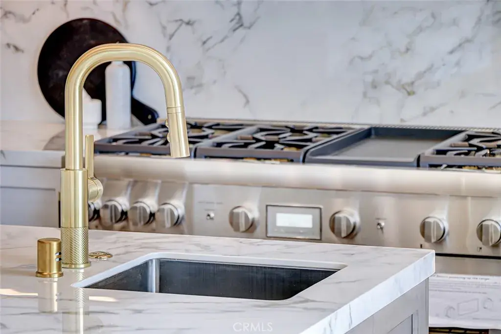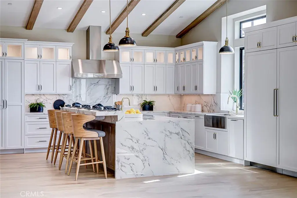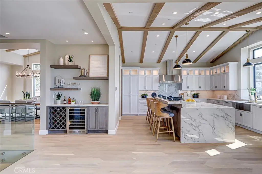 The kitchen is conceived as a refined working space for both everyday cooking and entertaining. Thermador appliances, dual dishwashers (including a multi-drawer unit), a butler’s pantry, and a dedicated beverage center are framed by oak flooring that continues into the main living areas, where fireplaces in both the living room and the primary suite introduce warmth and softness.