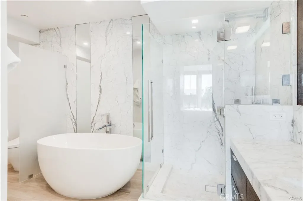 bedroom with ample closet space and an ultra-luxe en suite boasting a standalone soaking tub, a