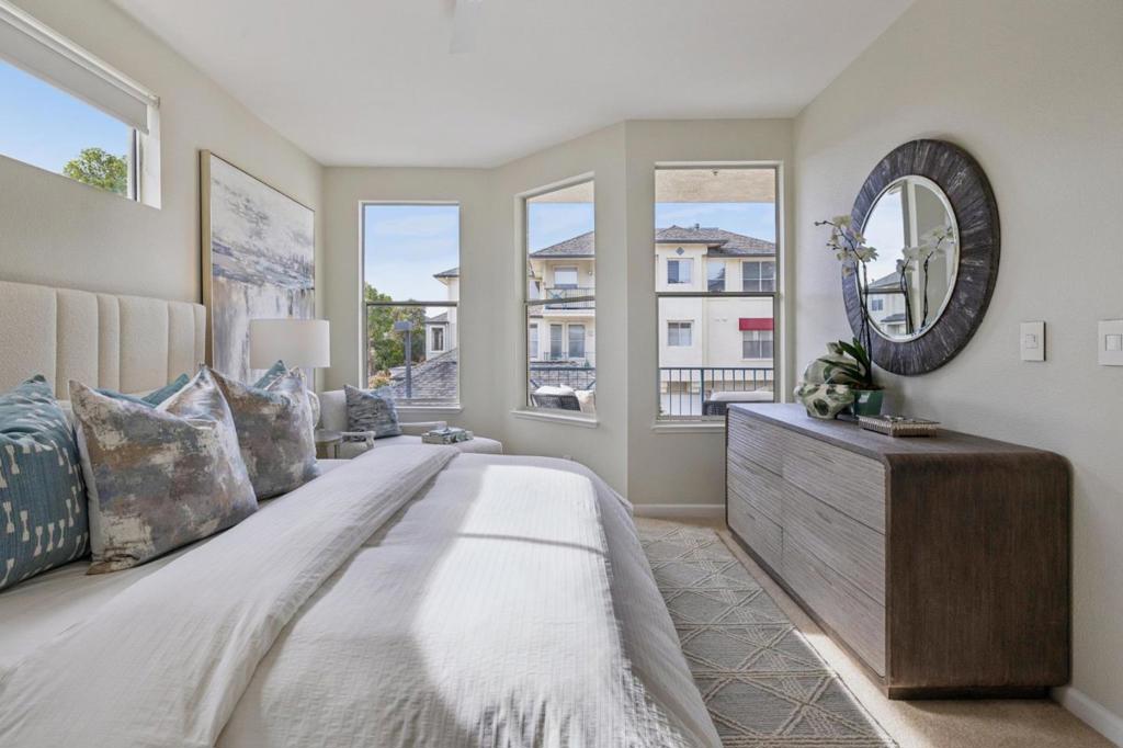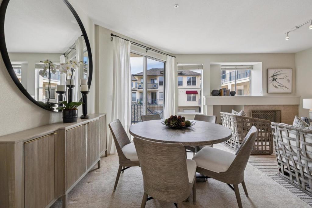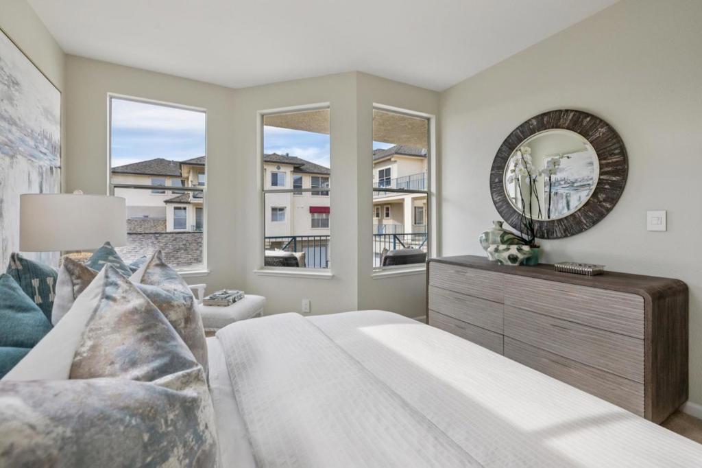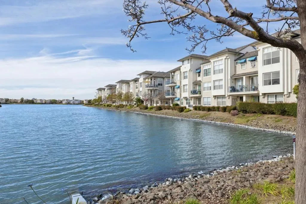 Updated modern condominium in Ventana del Mar on Redwood Shores Lagoon. Featuring a sought-after split-bedroom floor plan, this unit with two bedrooms and bathrooms centers on an open-concept living space. The open living and dining areas enjoy the warmth of a cozy fireplace and cool breeze from the balcony. The streamlined kitchen, boasting chic cabinets, quartz counters, and stainless steel appliances, overlooks the living space via a dining counter, perfect for entertaining. The primary suite offers a serene retreat with an array of windows and reading nook, a modern bathroom with double-sink vanity, and a walk-in closet with Elfa storage. A second bedroom with an adjacent bath, plus in-home laundry, adds ultimate convenience. Residents enjoy resort-style amenities, including a waterside pool, spa, fitness center, clubhouse, 2 parking spaces, and access to shoreline walking paths. Come live the dream!
