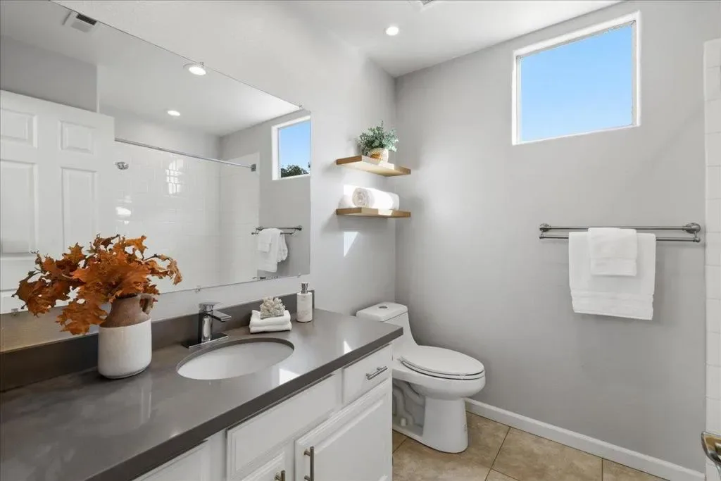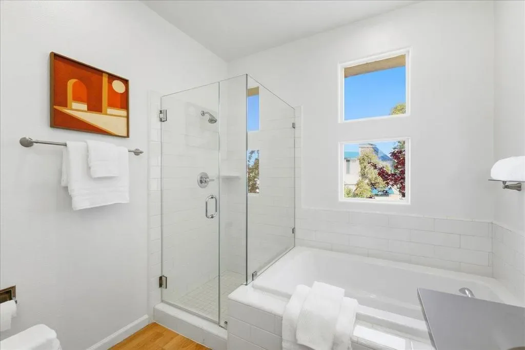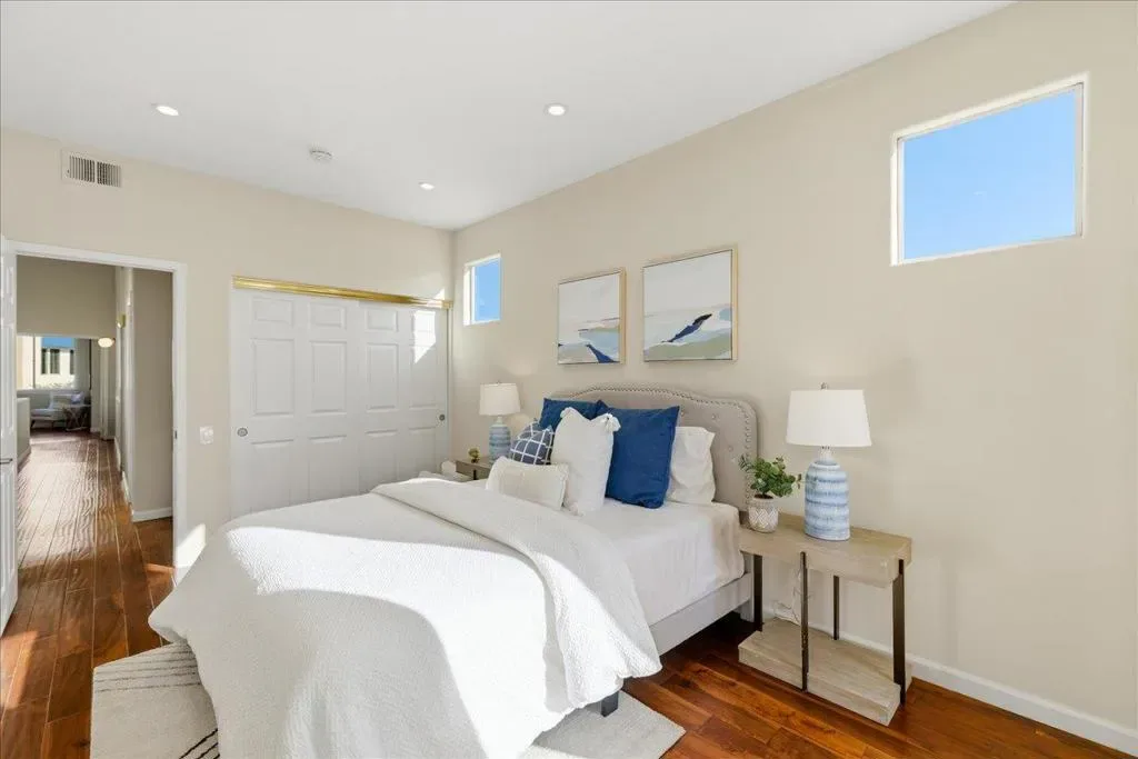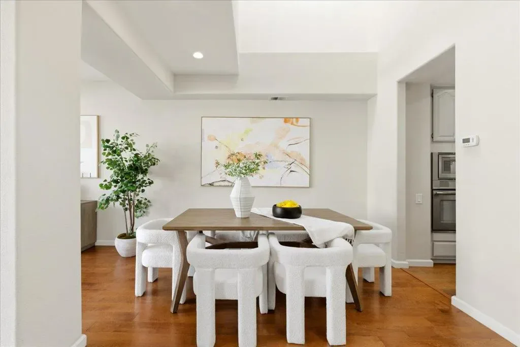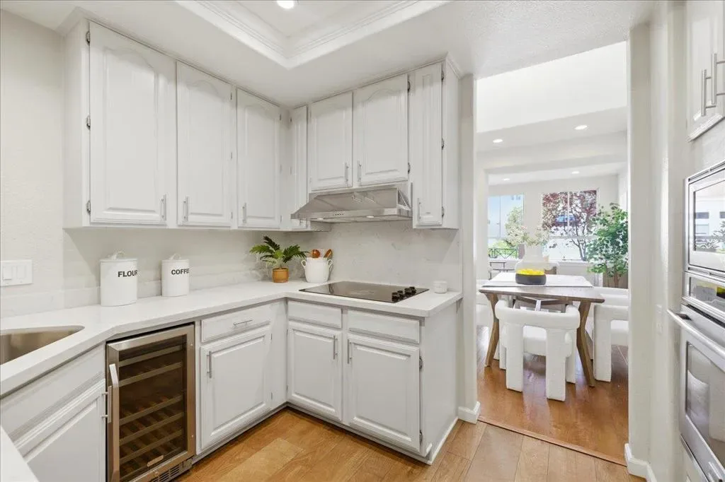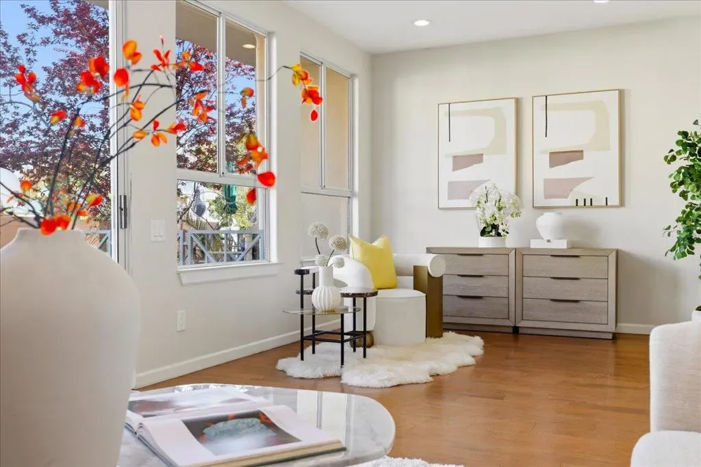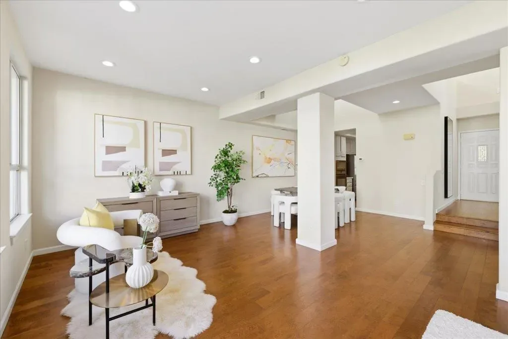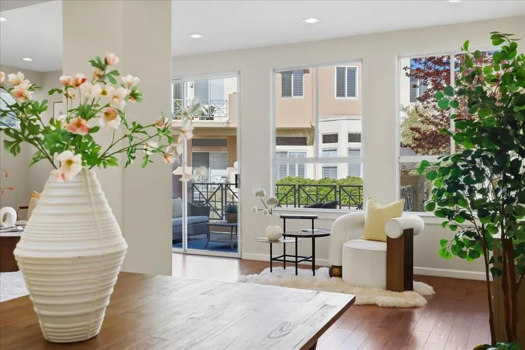 Beautifully situated in the desirable Lakeshore community of Redwood Shores, this bright and spacious corner-unit townhome offers approximately 1,996 sq ft of comfortable living space with 3 bedrooms and 2.5 bathrooms. The inviting living room opens to a private patio overlooking a tranquil waterway, creating a peaceful setting for relaxing or entertaining. The well-appointed kitchen features quartz countertops, stainless steel appliances, recessed lighting, and a charming breakfast area. Dramatic high ceilings and a striking spiral staircase enhance the homes open and airy feel while allowing abundant natural light throughout. Upstairs, the generous primary suite offers a walk-in closet and an updated bathroom with a frameless glass shower and soaking tub. Two additional bedrooms share access to a balcony, providing a pleasant outdoor retreat. Hardwood flooring throughout the whole property, in-unit laundry room, and attached two-car garage. Ideally located near scenic waterfront trails, parks, shopping, and major commute routes, and within a highly regarded school district. Enjoy the relaxed waterfront lifestyle that makes Redwood Shores one of the Peninsulas most desirable communities.