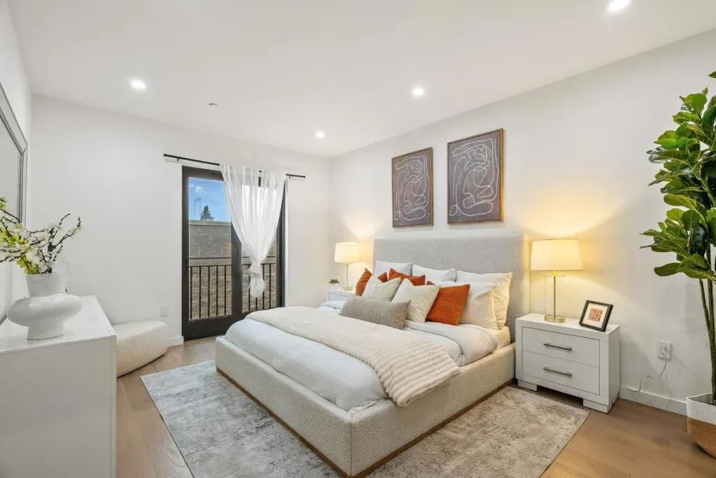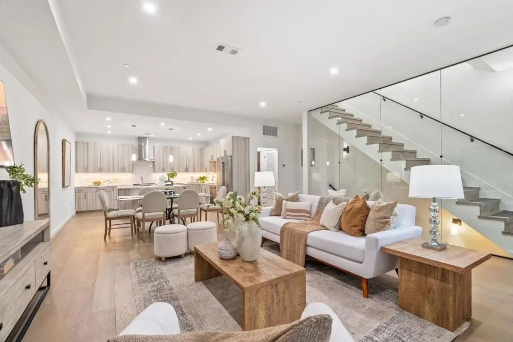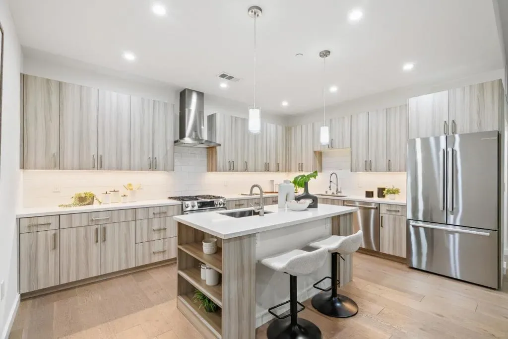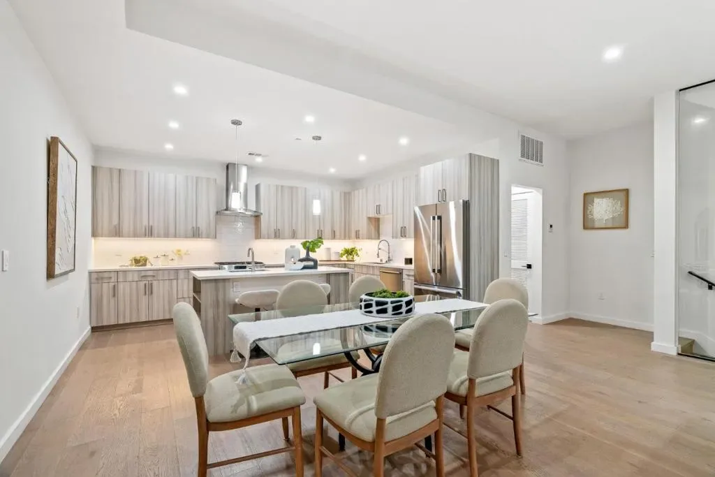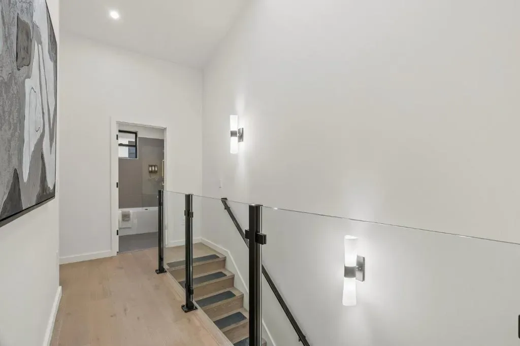 Sophisticated design and exceptional craftsmanship define 922 Woodside Road, a premier 3-bedroom, 3-bath residence offering approximately 1,906 sq ft of modern living. A rare first-floor bonus spaceideal for an office, lounge, or studio adds versatility and flexibility. Inside, soaring ceilings, wide-plank European white oak floors, sleek glass railings, and oversized high-performance windows create a bright, refined ambiance. Level 5 smooth wall finishes and upgraded insulation provide a quiet, polished interior. The gourmet kitchen features Bosch appliances with gas range, quartz countertops with full-height backsplash, custom soft-close cabinetry with dovetail drawers, and under-cabinet lighting. Bathrooms offer frameless glass showers, Hansgrohe fixtures, and quartz surfaces. A glass balcony railing extends the living space outdoors. The attached 2-car garage is pre-wired for EV charging. Secured entry and full perimeter fencing complete this private luxury offering.
