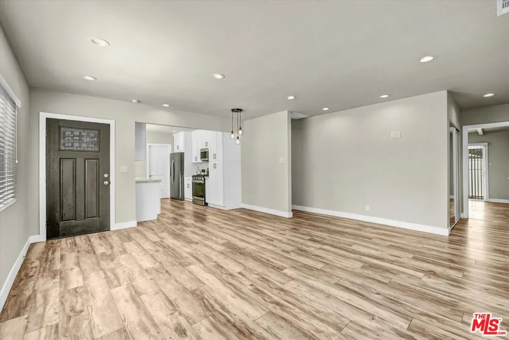 Welcome to this beautifully remodeled 3-bedroom, 2-bath front house located on a quiet residential street with plenty of parking. This bright and inviting home features a modern open floor plan with recessed lighting, central A/C, and all-newer finishes throughout. Enjoy newer kitchen with white cabinetry and stainless steel appliances, fully remodeled bathrooms, and newer dual-pane windows with stylish blinds. The spacious master suite offers a cozy fireplace and closet space. A separated laundry room with washer & dryer is included for convenience. Separate entrances for each home, a huge front yard, and multiple dedicated parking spaces. All newer appliances are included, making this home truly move-in ready.