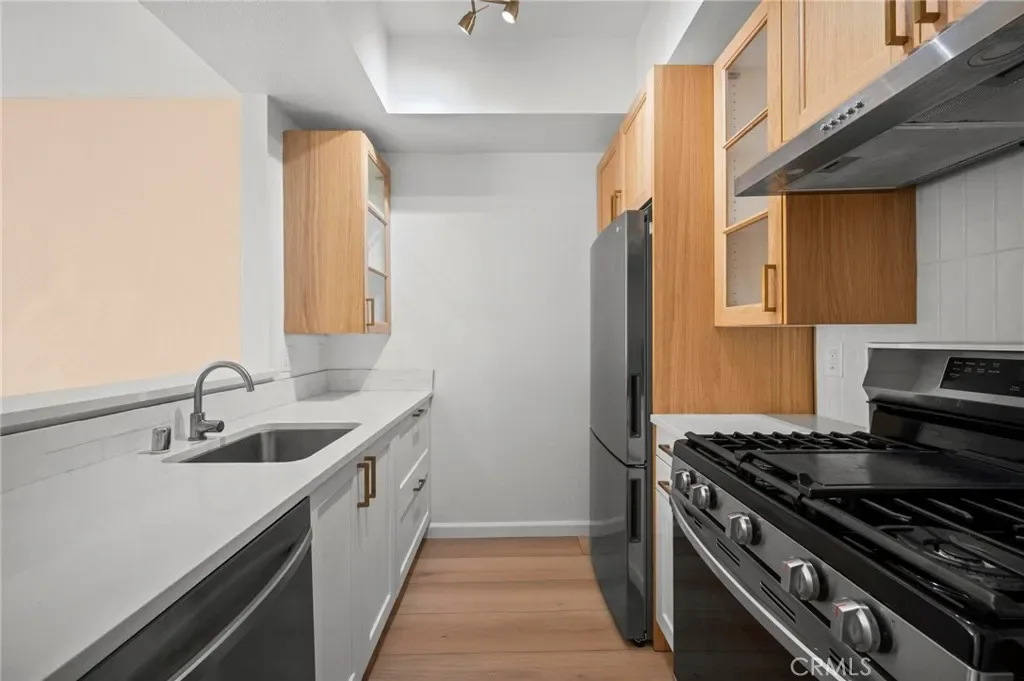 Fully renovated, move in ready top floor condo in the heart of Reseda. This upper level unit offers privacy and has been updated throughout with new flooring, recessed lighting, a warm toned textured accent wall, wood slat feature wall with floating media shelf, and a fireplace in the living room. The open concept layout flows from the spacious living and dining area through a pass through into the updated galley kitchen featuring white cabinetry, wood upper cabinets with glass fronts, quartz countertops, vertical subway tile backsplash, stainless steel appliances including a gas range, and brass hardware. Large windows and a sliding glass door open to a private balcony and bring in abundant natural light.