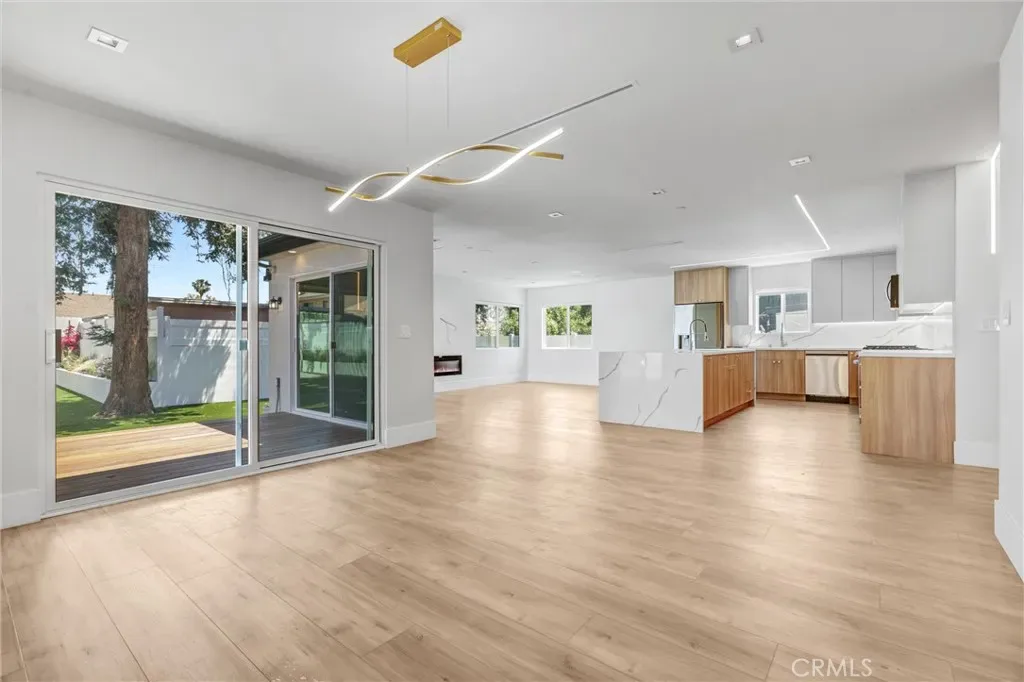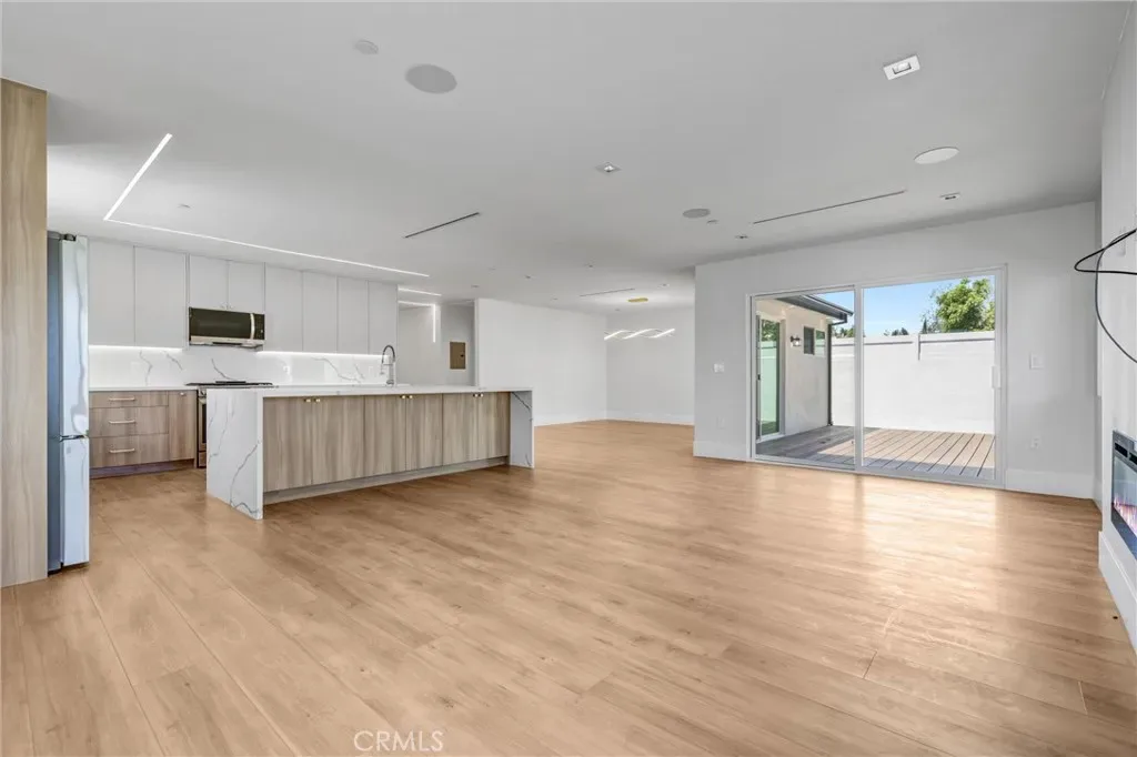 The primary residence is designed for modern living, showcasing a bright open-concept layout filled with natural light. The chef’s kitchen centers around an oversized island with custom cabinetry and premium stainless steel appliances. The spacious living room features a statement fireplace and oversized windows, with double doors opening to a private backyard deck surrounded by mature landscaping — creating seamless indoor-outdoor flow ideal for both everyday living and entertaining.