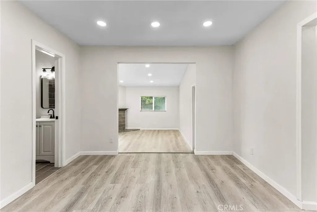 The home has been completely remodeled and welcomes you with a spacious living room at the front of the home, complete with recessed lighting and a seamless flow into the dining area, conveniently located just off the stunning new kitchen. The kitchen showcases white quartz countertops, crisp white cabinetry, and stainless steel appliances including a gas range, microwave, and dishwasher.