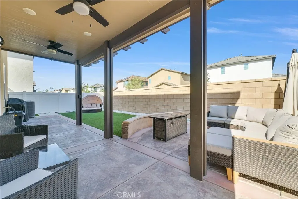Step outside to a beautifully finished backyard, complete with low-maintenance artificial turf, a concrete patio with custom Alumawood patio cover, circular brick seating, and a separate concrete slab ready for a portable outdoor kitchen setup—perfect for outdoor gatherings.