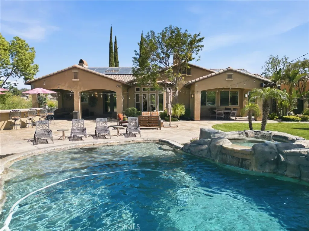 outside to a resort-style backyard featuring a heated saltwater PebbleTec pool