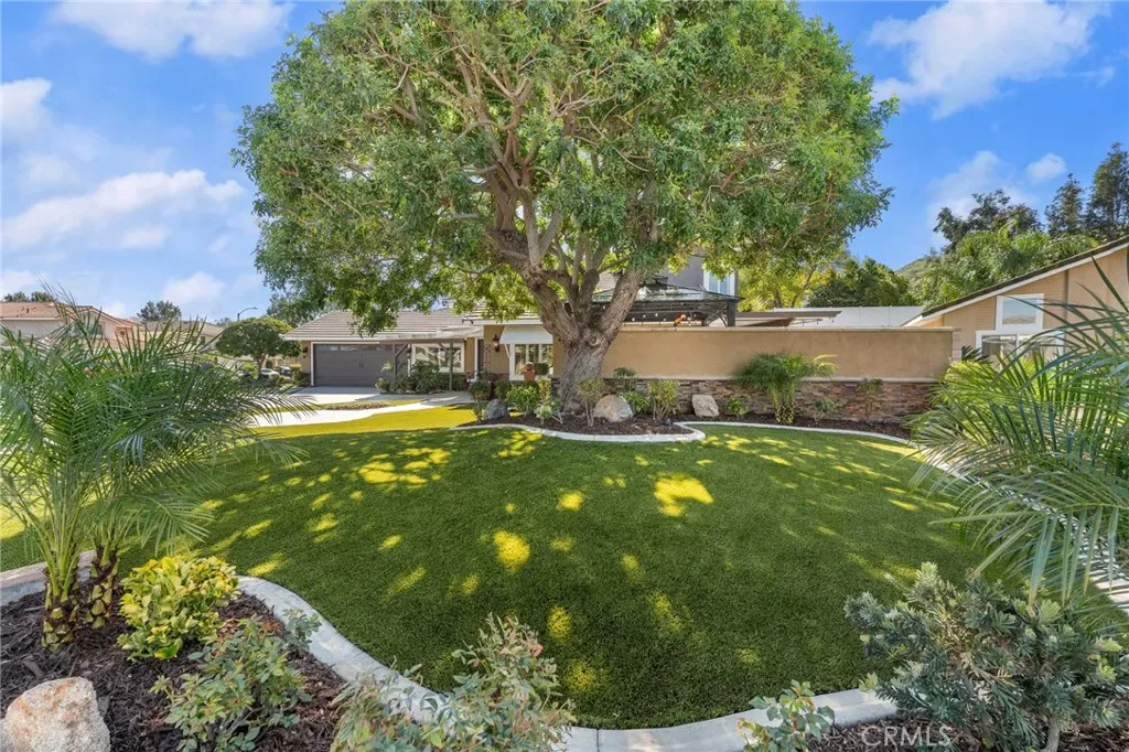 The home’s front yard immediately creates eye-catching curb appeal with mature trees, drought-tolerant landscaping, and a decorative fountain that provides a welcoming first impression upon arrival.