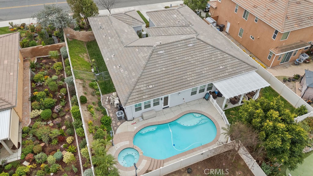 Immaculate Pool Home Opportunity! This gorgeous single story, beautifully maintained open floor plan home features brand new fresh exterior paint, custom built-in cabinet/storage/displays, custom wooden shutters and motorized custom blinds with recent installation of Revwood Mohawk flooring throughout the home. (laundry room and master bathroom are tiled) Both gas and electric dryer hookup. Interior laundry. New Quartz kitchen counters and custom backsplash. Tankless water heater. Tandem 3 car garage. New Garage Door Opener. Custom stained glass in kitchen cabinets and built-in cabinetry. Exterior Blink Camera System with App hooked to Alexa. Double pane windows, Energy Star Appliances and low maintenance landscape. Fenced pool and waterfall feature. Access to your office/retreat/or 4th bedroom conversion through the beautiful Barnyard doors with Atrium access from this room. Low HOA. Close to schools, shopping and freeway access. This home defines, “move-in ready”. Come see why this is the perfect place to call HOME in Riverside.