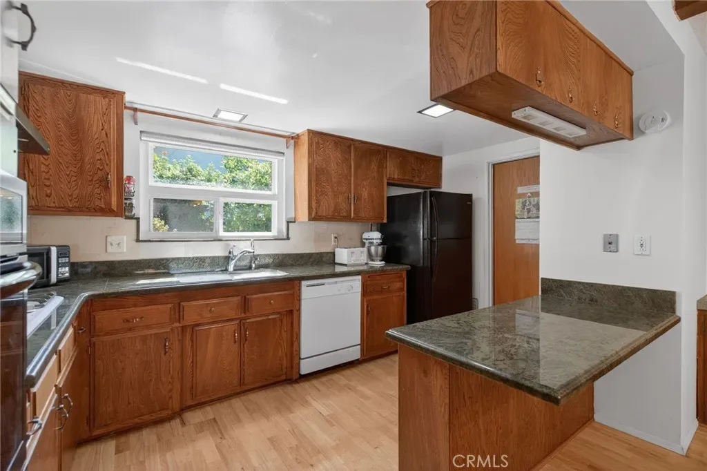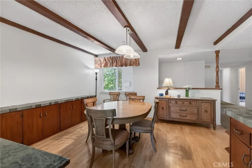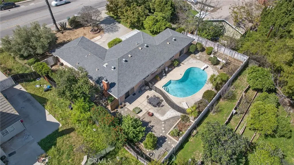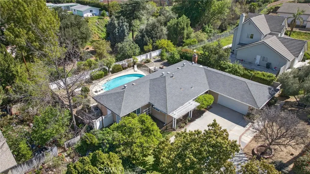 The property boasts a generous lot featuring a sparkling pool, breathtaking mountain views, and a terraced backyard that gently slopes to a seasonal stream. Fruit lovers will delight in the variety of fruit trees dotting the landscape. Inside, you’ll find an updated kitchen, remodeled bathrooms, and a spacious, open floor plan with wide hallways that enhance the home’s airy, inviting feel.