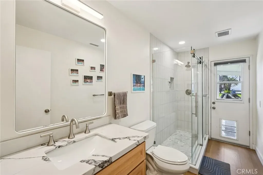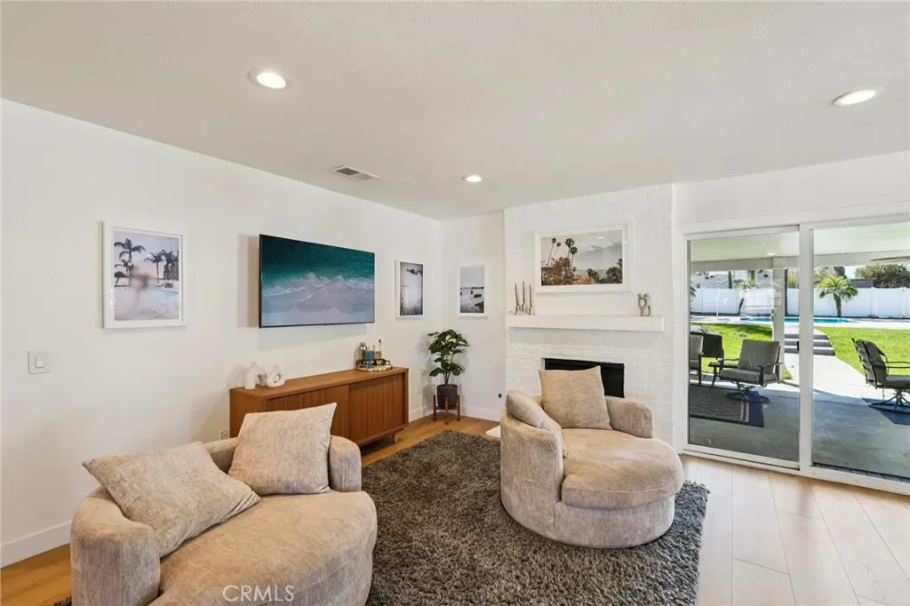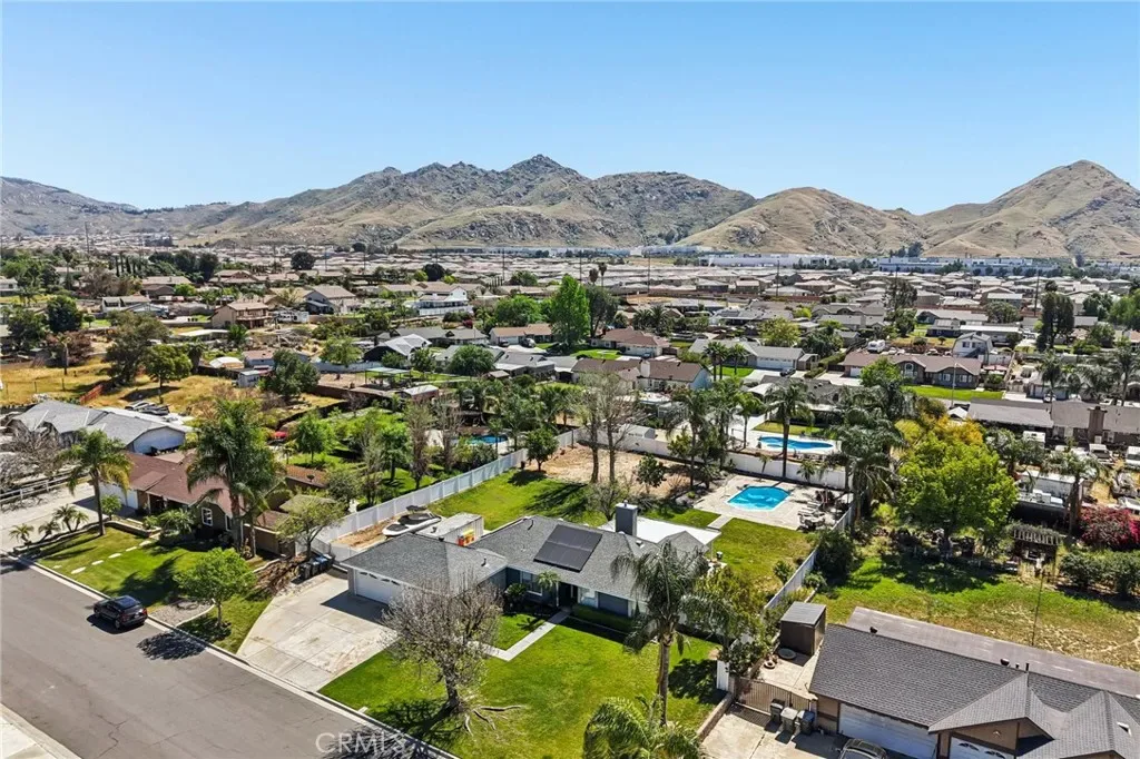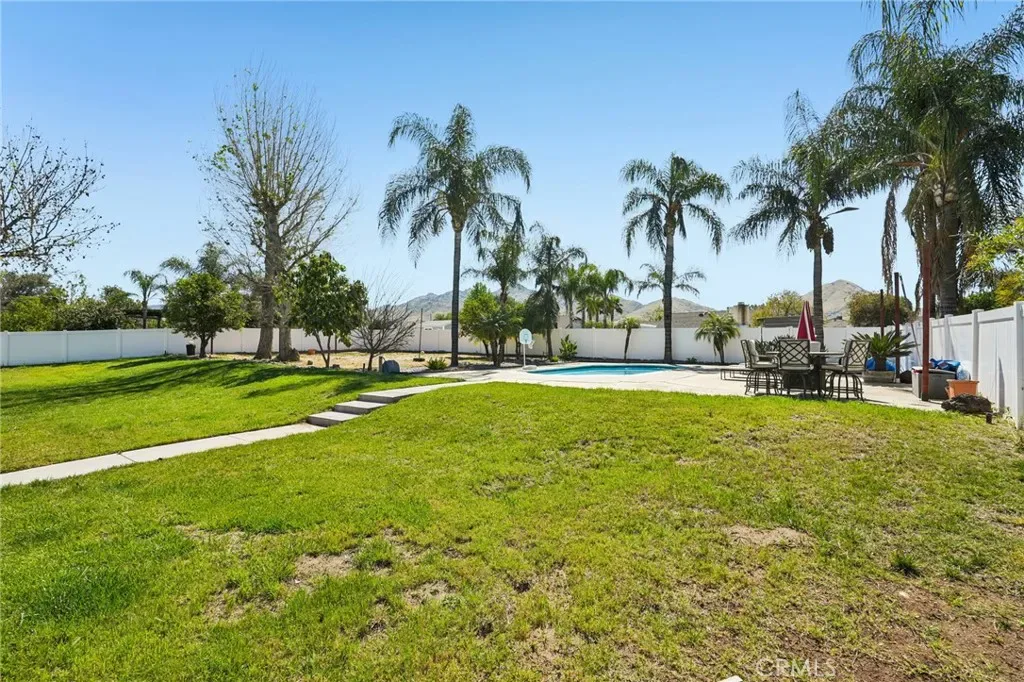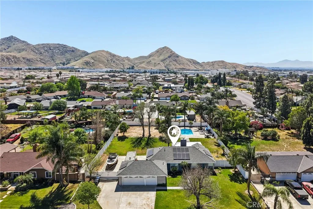 Welcome to 470 Conners Ln in Riverside, California. This beautifully upgraded single-story cul-de-sac pool home offers 3 bedrooms, 2 bathrooms, and a spacious 3-car garage, all situated on nearly half an acre of land. This property features gated RV parking and fully paid-off solar, providing both convenience and energy efficiency. Step through the inviting double door entry into a bright and open great room that seamlessly combines the living room, dining area, and upgraded kitchen. The kitchen is designed for both function and style, featuring new cabinets, stunning marble countertops with a waterfall edge, a breakfast bar, new appliances, and a sleek stainless steel hood vent over the stovetop. Bay windows offer picturesque views of the backyard and pool, while new waterproof wood laminate flooring and LED lighting enhance the modern feel throughout the main living spaces. A cozy fireplace in the dining area, currently styled as a sitting room, adds warmth and versatility. Down the hall, the guest bathroom has been tastefully remodeled with a quartz countertop sink and updated shower, along with convenient access to the backyard. The primary suite is a true retreat, filled with natural light and featuring dual closets and a beautifully upgraded bathroom complete with a walk-in shower, new fixtures, and a quartz countertop vanity. Step outside to your private backyard oasis, where an expansive layout offers the perfect setting for relaxation and entertaining. Enjoy year around outdoor living under the large covered Alumawood patio equipped with ceiling fans and hookups for a refrigerator and TV. The sparkling pool, paired with a generous grassy area, multiple fruit trees and white vinyl fencing create a resort-style atmosphere with ample space for gatherings and leisure.