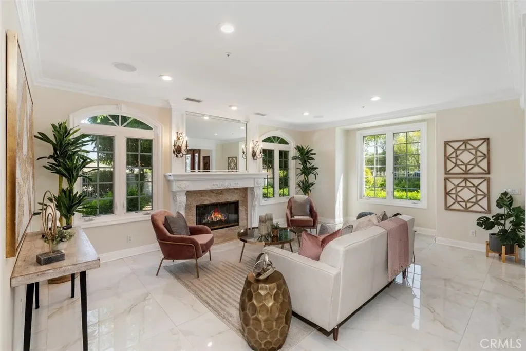 The luxurious primary suite is a true retreat with a private balcony, cozy fireplace, spa-inspired bathroom with jetted soaking tub, steam shower, sauna access, dual vanities, makeup vanity, and a spacious walk-in closet with custom built-ins.