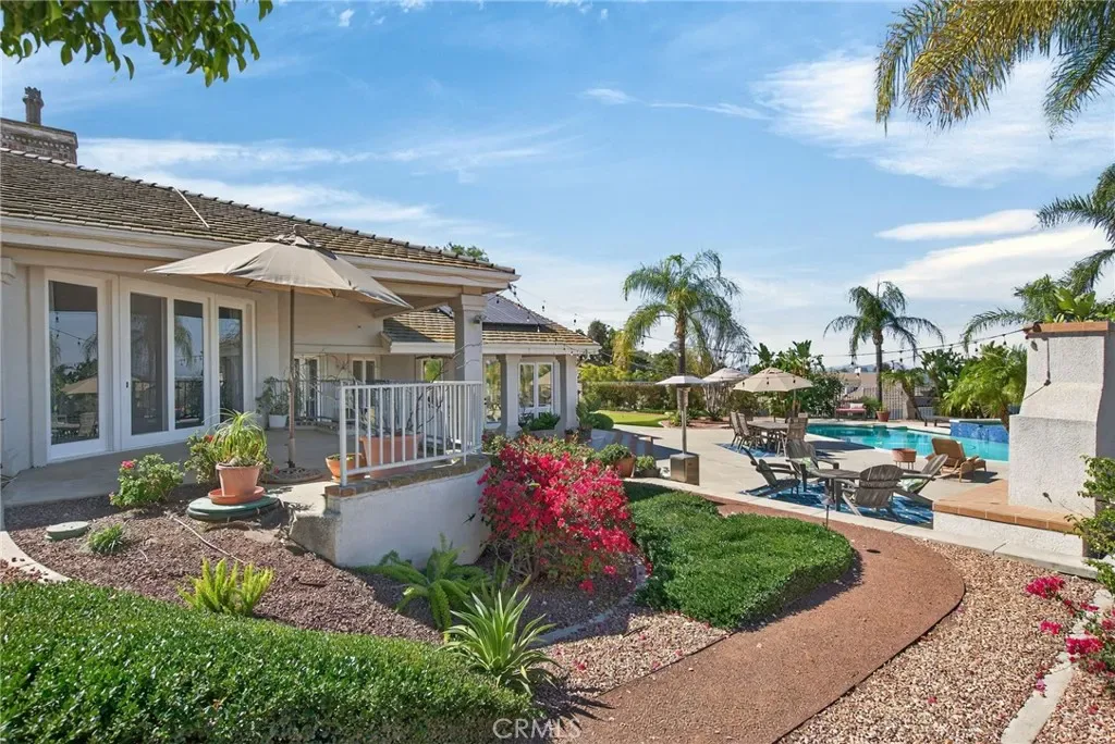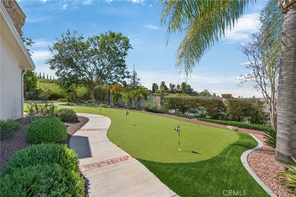 Outdoors, the professionally landscaped grounds are a true oasis, designed with water-wise plantings and featuring a sparkling pool, spa, and putting green. The expansive deck offers both covered and open-air spaces, perfect for entertaining, with an outdoor fireplace and built-in grill ready for gatherings of any size. Additional highlights include a four-car garage, extensive off-street parking, and the energy efficiency of an owned solar system.