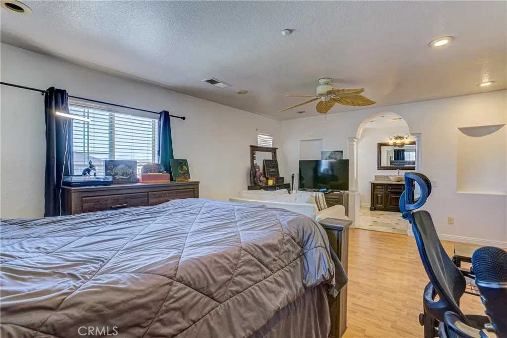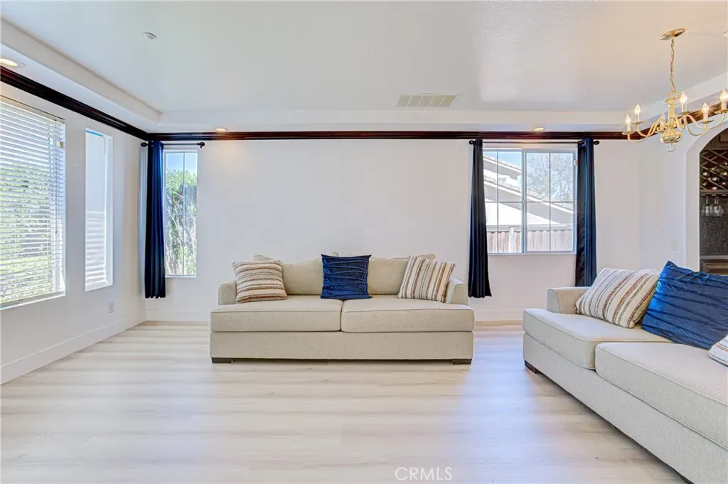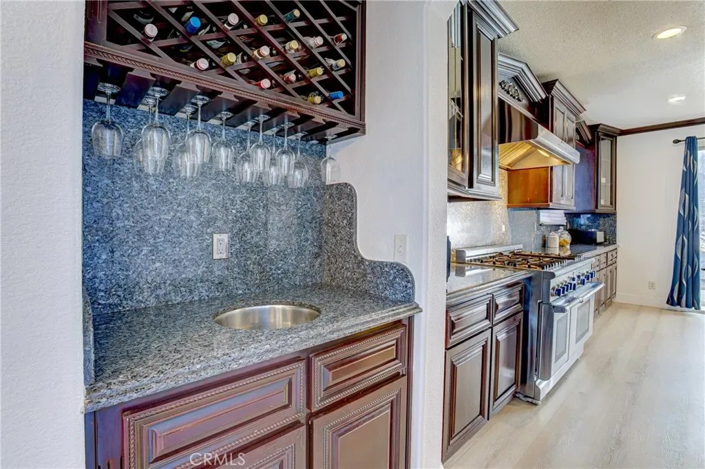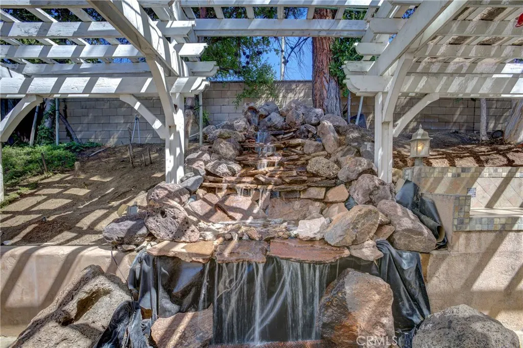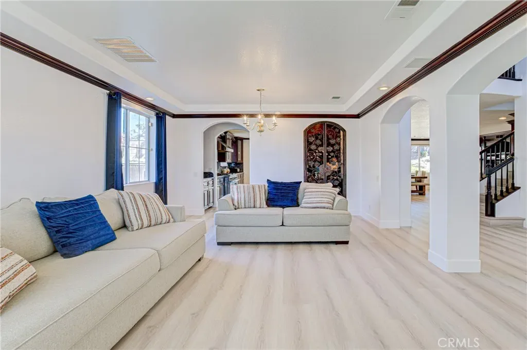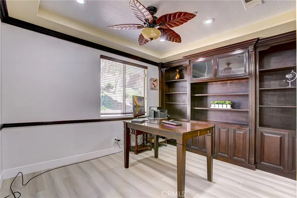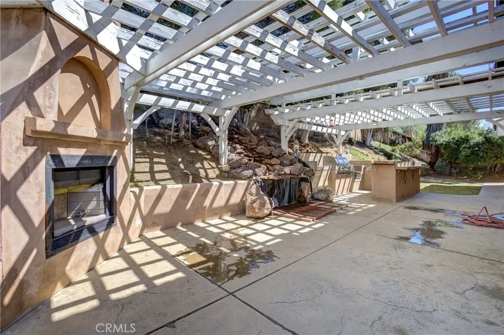 Located in the highly desirable Orangecrest this spacious home offers nearly 3,600 square feet of living space, highlighted by two primary suites and quality wood built-in cabinterty throughout. Elegant finishes, including extensive custom woodwork, rich cabinetry, and new flooring that flows throughout much of the interior. Architectural details such as custom archways create a sense of openness. The spacious chef’s kitchen is designed for both everyday living and entertaining. It features stainless steel appliances, granite countertops with an island with wraparound seating, and abundant custom cabinet. The main level offers multiple spaces for entertaining including a formal dining room, an inviting living room, a custom wine closet, and a wet bar. A dedicated office with built-in custom bookcases provides a functional workspace or library. Additional downstairs amenities include a full bathroom, laundry room and a three-car garage. Upstairs, the expansive primary owner’s suite features a separate sitting or retreat area, a spacious walk-in closet, and a large en-suite bath. A second junior primary suite offers excellent flexibility for multi-generational living or guest accommodations. This private suite includes its own en-suite bathroom with shower, dual sinks, and toilet, while the bedroom is large enough to accommodate a seating area. Two additional generously sized bedrooms are also located upstairs and share a well-appointed full bathroom. The backyard features a custom built-in waterfall that creates a relaxing focal point. The outdoor kitchen with built-in BBQ grill and a large covered patio provide the perfect setting for gatherings, dining, and year-round outdoor living.