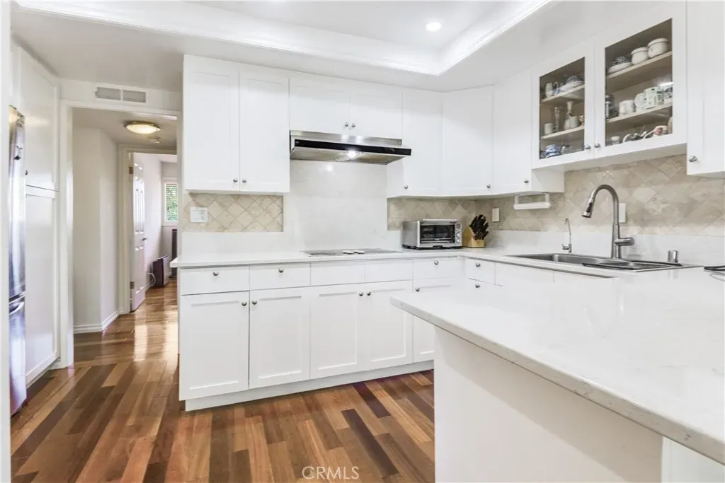 The residence features numerous upgrades including; wood flooring, a remodeled kitchen with granite countertops, main-floor bathroom, downstair 2nd bathroom, smooth ceilings, recessed lighting and a newer roof. This spacious unit offers three bedrooms and three full bathrooms, plus a versatile den, along with a large private patio overlooking serene greenbelt views from the breakfast area, dining room, and living room. The spacious primary suite include two walk-in closets. One bedroom is conveniently located on the main floor with a full bath nearby. The main-floor den can be easily converted into a fourth bedroom. A separate dining room adds to the home’s functionality and appeal.