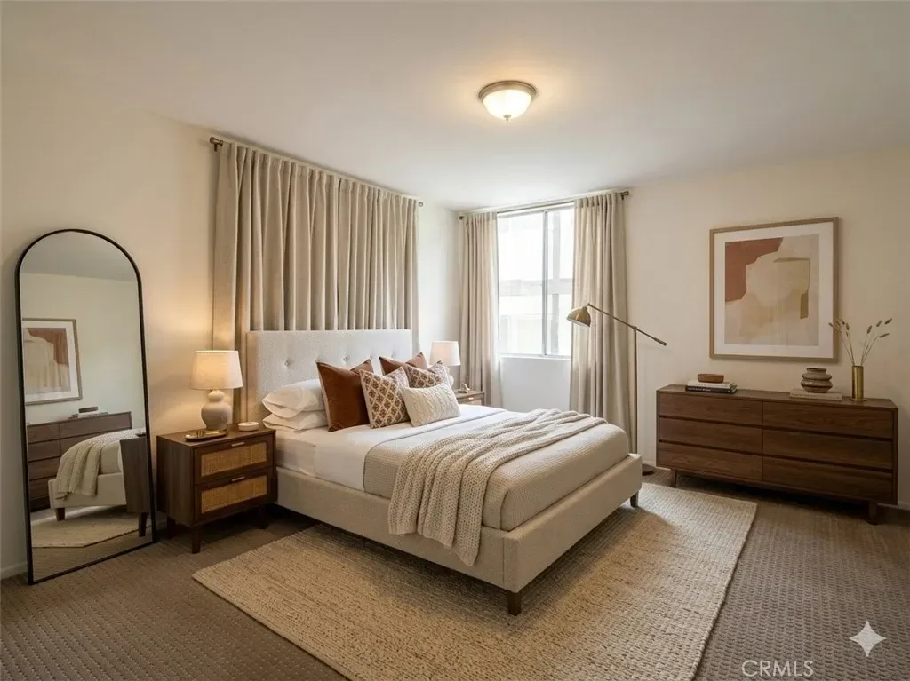 The spacious living room features a statement fireplace and custom wet bar, making it perfect for hosting. Sliding glass doors lead to a generous private patio, ideal for reading and relaxing.