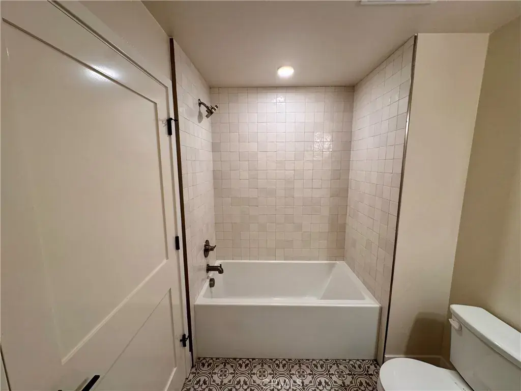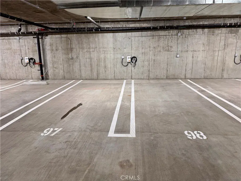 The spacious primary suite with an attached private balcony includes a spa-inspired bathroom with a glass-enclosed walk-in shower, quartz counters, designer porcelain tile, and contemporary stainless-steel accents. Additional highlights include central A/C and heating, recessed LED lighting, in-unit front-loading washer and dryer, and two assigned parking spaces with access to EV charging.